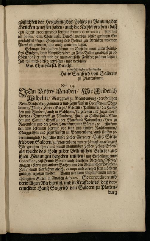 götzlichkeit vor Hergebung des Holtzes zu Basoung der Brücken genoſſen haben/ auch die Rechte ſprechen/ daß qui ſentit incommoda ſentiat etiam commoda; Als wil ich hoffen/ Ew. Churfuͤrſtl. Durchl. werden dieſer geringen Ergoͤtzlichkeit/ kegen Hergebung des Holtzes zur Brücken/ wie vor Alters iſt geweſen/ mir auch genieſſen laſſen. a Gelanget derohalben hiemit an Dieſelbe mein unterthänig« ſtes Suchen/ dem Amptſchreiber zu Fehr⸗Bellin gnaͤdigſt zu befehlen/ daß er mir und die meinigen ſolle Zollfrey palſiren laſſen: Ich wil mich dieſes getroͤſten/ und verbleibe Ew. Churfuͤrſtl. Durchl. unterthaͤnigſter gehorſamſter Hans Siegfried von Saldern/ zu Plaͤttenburg. ; Nto. 1 9.; 15 ö Won Bottes Bnaden/ Wir Mriderich Milhelm/ Marggraff zu Brandenburg/ des Heiligen Roͤm. Reichs Ertz⸗Cammerer und Churfuͤrſt in Preuſſen/ zu Magdeburg/ Juͤlich/ Cleve/ Berge/ Stettin/ Pommern der Kaſſuben und Wenden/ auch in Schleſien/ zu Croſſen und Jaͤgerndorff Hertzog/ Burggraff zu Nuͤrnberg/ Juͤrſt zu Halberſtadt/ Minden und Camin/ Graff zu der Marck und Ravensberg/ Herꝛ zu Ravenſtein und der Lande Lauenburg und Buͤtow/ ꝛc. Uhrkunden und bekennen hiermit vor Uns und Unſere Nachkommen/ Marggraffen und Ehurfuͤrſten zu Brandenburg/ auch ſonſten jedermaͤnniglich/ daß Uns Unſer Lieber Getreuer Hans Siegfried von Saldern/ zu Plattenburg/ unterthaͤnigſt angelanget/ Wir geruhen ihm/ und feinen männlichen Leibes Lehns⸗Erben/ als welche das Holtz zu der Belliniſchen Bruͤcke/ aus ihren Hoͤltzungen hergeben muͤſten/ mit Ertheilung einer Conceſſion, daß Er und Sie als auch deroſelbe Bediente Pferde/ Wagen/ Korn und andere Sachen von den Belliniſchen BruͤckenZoll/ feinen Vorfahren gleich/ exempt und befreyet ſeyn möchten! gnaͤdigſt ergoͤtzen wolten. Wann wir dann ſolchem feinem unterthaͤnigſten Bitten in Gnaden deferiret. Soconcediren und verwilligen Wir hiermit/ und in Krafft dieſes/ daß vorermeldter Hanß Siegfried von Saldern zu 1