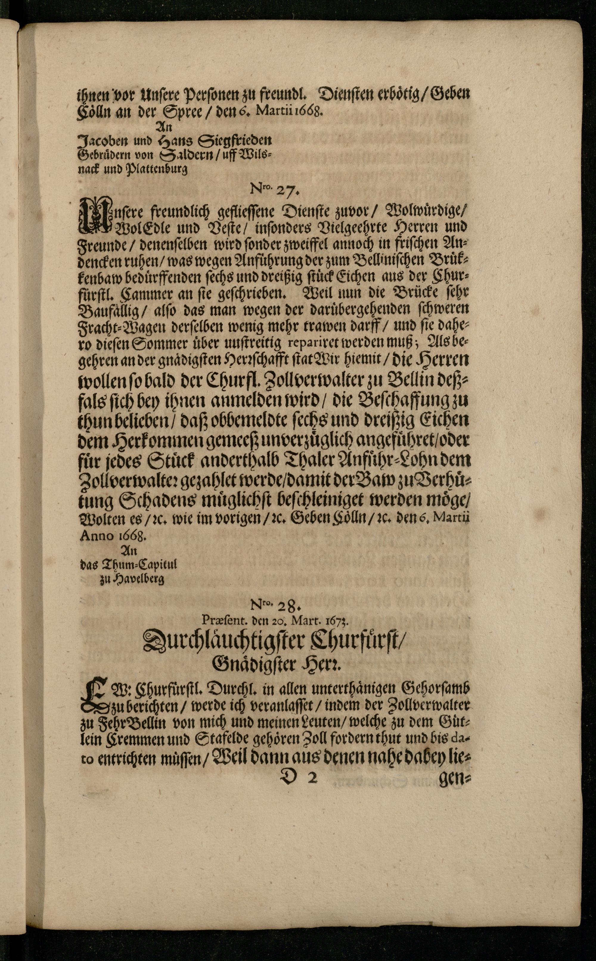 f Nr 27. ) Ua freundlich geflieſſene Dienſte zuvor/ Wolwuͤrdige/ WolEdle und Veſte/ inſonders Vielgeehrte Herren und Freunde/ denenſelben wird ſond er zweiffel annoch in friſchen Andencken ruhen/ was wegen Anfuͤhrung der zum Belliniſchen Bruͤkkenbaw beduͤrffenden ſechs und dreißig ſtuͤck Eichen aus der Churfürſtl. Cammer an fie geſchrieben. Weil nun die Brücke ſehr Baufaͤllig/ alſo das man wegen der daruͤbergehenden ſchweren Fracht⸗Wagen derſelben wenig mehr trawen darff/ und ſie dahero dieſen Sommer uͤber uuſtreitig repariret werden muß; Als begehren an der gnaͤdigſten Herꝛſchafft ſtat Wir hiemit/ die Herren wollen fo bald der Churfl. Zollverwalter zu Bellin deßfals ſich bey ihnen anmelden wird/ die Beſchaffung zu thun belieben/ daß obbemeldte ſechs und dreißig Eichen dem Herkommen gemeeß unverzüglich angefuͤhret/ oder für jedes Stück anderthalb Thaler Anfſihr⸗Lohn dem Zollverwalteꝛ gezahlet werde/ damit der Bam zu Verhuͤtung Schadens muͤglichſt beſchleiniget werden moͤge/ „ CO/20 wie im vorigen/ ꝛc. Geben Koͤlln/ ꝛc. den 6. Marti nno 1668.