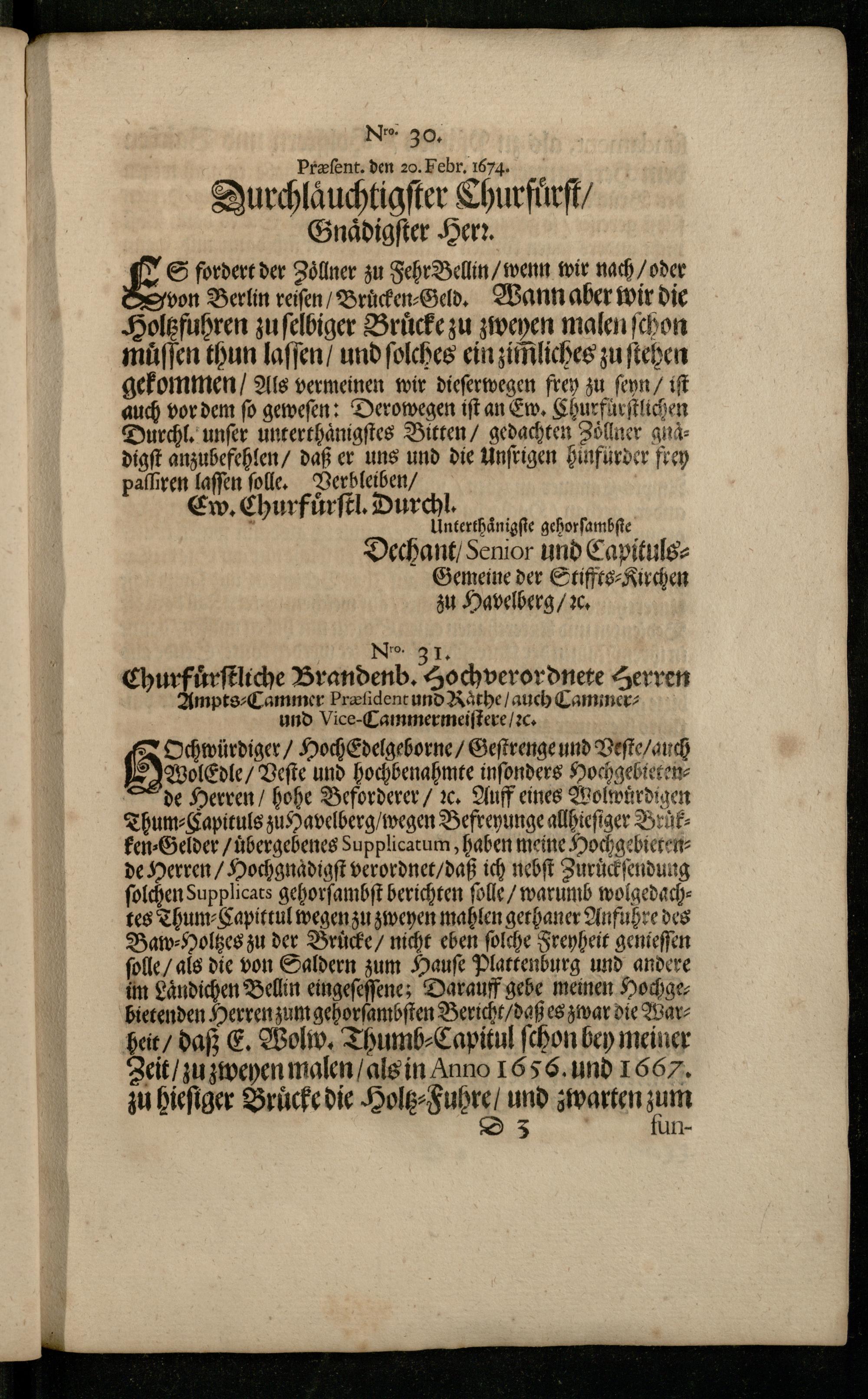 5 Ochwürdiger/ HochEdelgeborne/ Geſtrenge und Veſte/ auch Wolle Veſte und hochbenahmte inſonders HochgebietenAde Herren/ hohe Beforderer/ ꝛc. Auff eines Wolwuͤrdigen Thum⸗Capituls zu Havelberg/ wegen Befreyunge allhieſiger Bruͤkken⸗Gelder/ uͤbergebenes Supplicatum, haben meine Hochgebietende Herren/ Hochgnaͤdigſt verordnet/ daß ich nebſt Zuruͤckſendung ſolchen Supplicats gehorſambſt berichten ſolle/ warumb wolgedachtes Thum⸗Capittul wegen zu zweyen mahlen gethaner Anfuhre des Baw⸗Holtzes zu der Bruͤcke/ nicht eben ſolche Freyheit genteſſen ſolle/ als die von Saldern zum Hauſe Plattenburg und andere im Laͤndichen Bellin eingeſeſſene; Darauff gebe meinen Hochgebietenden Herren zum gehorſambſten Bericht/ daß es zwar die Warheit/ daß E. Wolw. Thumb⸗Capitul ſchon bey meiner Zeit/ zu zweyen malen/ als in Anno 1656. und 1667. zu hieſiger Bruͤcke die Holtz⸗Fuhre/ und zwarten zun