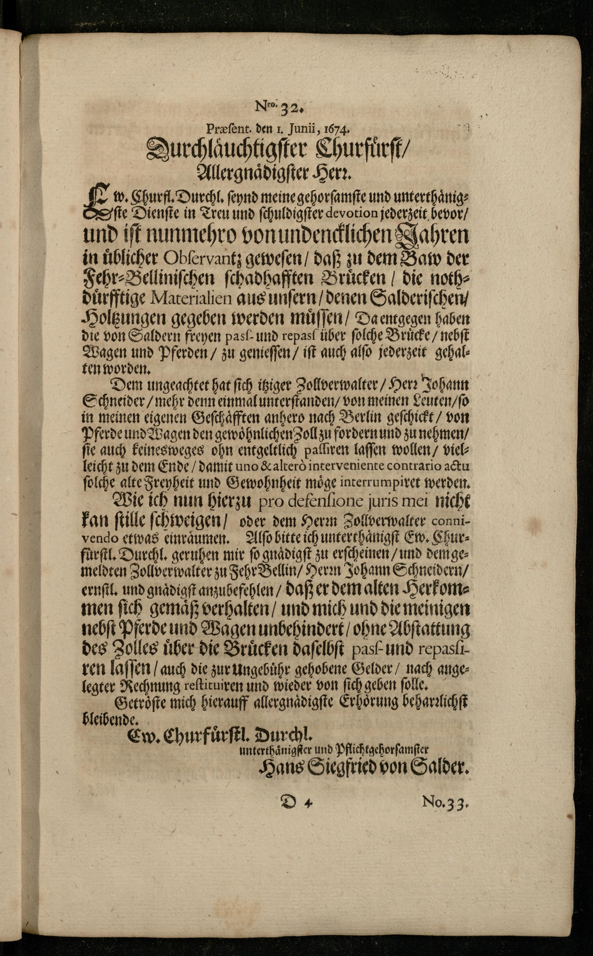Wie ich nun hierzu pro defenfione juris mei nicht kan ſtille ſchweigen/ oder dem Herꝛn Zollverwalter connivendo etwas einräumen. Alſo bitte ich unterthaͤnigſt Ew. Churfuͤrſtl. Durchl. geruhen mir ſo gnaͤdigſt zu erſcheinen und dem gemeldten Zollverwalter zu Fehr Bellin/ Herꝛn Johann Schneidern/ ernſtl. und gnaͤdigſt anzubefehlen/ daß er dem alten Herkommen ſich gemäß verhalten/ und mich und die meinigen nebſt Pferde und Wagen unbehindert/ ohne Abſtattung des Zolles über die Brücken daſelbſt pas und repaslıren laſſen/ auch die zur ungebuͤhr gehobene Gelder/ nach angelegter Rechnung reſtituiren und wieder von ſich geben ſolle. 110 Getroͤſte mich hierauff allergnaͤdigſte Erhoͤrung beharꝛlichſt