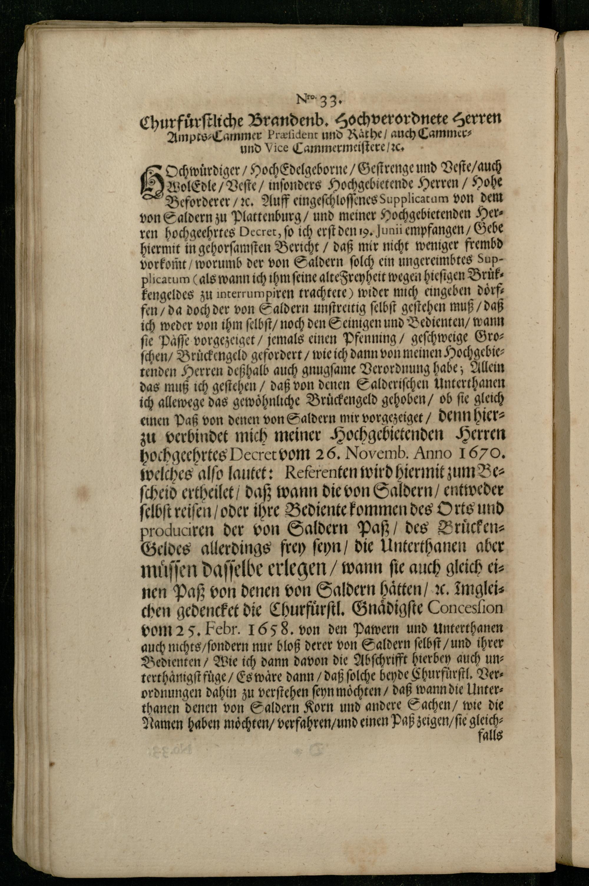 8 Ochwuͤrdiger/ HocheEdelgeborne/ Geſtrenge und Veſte/ auch 2 WolEdle/ Veſte/ inſonders Hochgebietende Herren/ Hohe Beforderer/ ꝛc. Auff eingeſchloſſenes Supplicatum von dem von Saldern zu Plattenburg/ und meiner Hochgebietenden Herren hochgeehrtes Decret, fo ich erſt den 19, Juni empfangen/ Gebe hiermit in gehorſamſten Bericht/ daß mir nicht weniger frembd vorkom̃t/ worumb der von Saldern ſolch ein ungereimbtes Supplicatum( als wann ich ihm feine alte Freyheit wegen hieſigen Bruͤkkengeldes zu interrumpiren trachtete) wider mich eingeben doͤrffen/ da doch der von Saldern unſtreitig ſelbſt geſtehen muß/ daß ich weder von ihm ſelbſt/ noch den Seinigen und Bedienten/ wann fie Paͤſſe vorgezeiget/ jemals einen Pfenning/ geſchweige Groſchen/ Bruͤckengeld gefordert/ wie ich dann von meinen Hochgebietenden Herren deßhalb auch gnugſame Verordnung habe; Allein das muß ich geſtehen/ daß von denen Salderiſchen Unterthanen ich allewege das gewoͤhnliche Bruͤckengeld gehoben/ ob fie gleich einen Paß von denen von Saldern mir vorgezeiget/ denn hierzu verbindet mich meiner Hochgebietenden Herren hochgeehrtes Decret vom 26. Novemb. Anno 1670, welches alſo lautet: Referenten wird hiermit zum Beſcheid ertheilet/ daß wann die von Saldern/ entweder ſelbſt reiſen/ oder ihre Bediente kommen des Orts und produciren der von Saldern Paß/ des BruͤckenGeldes allerdings frey ſeyn/ die Unterthanen aber