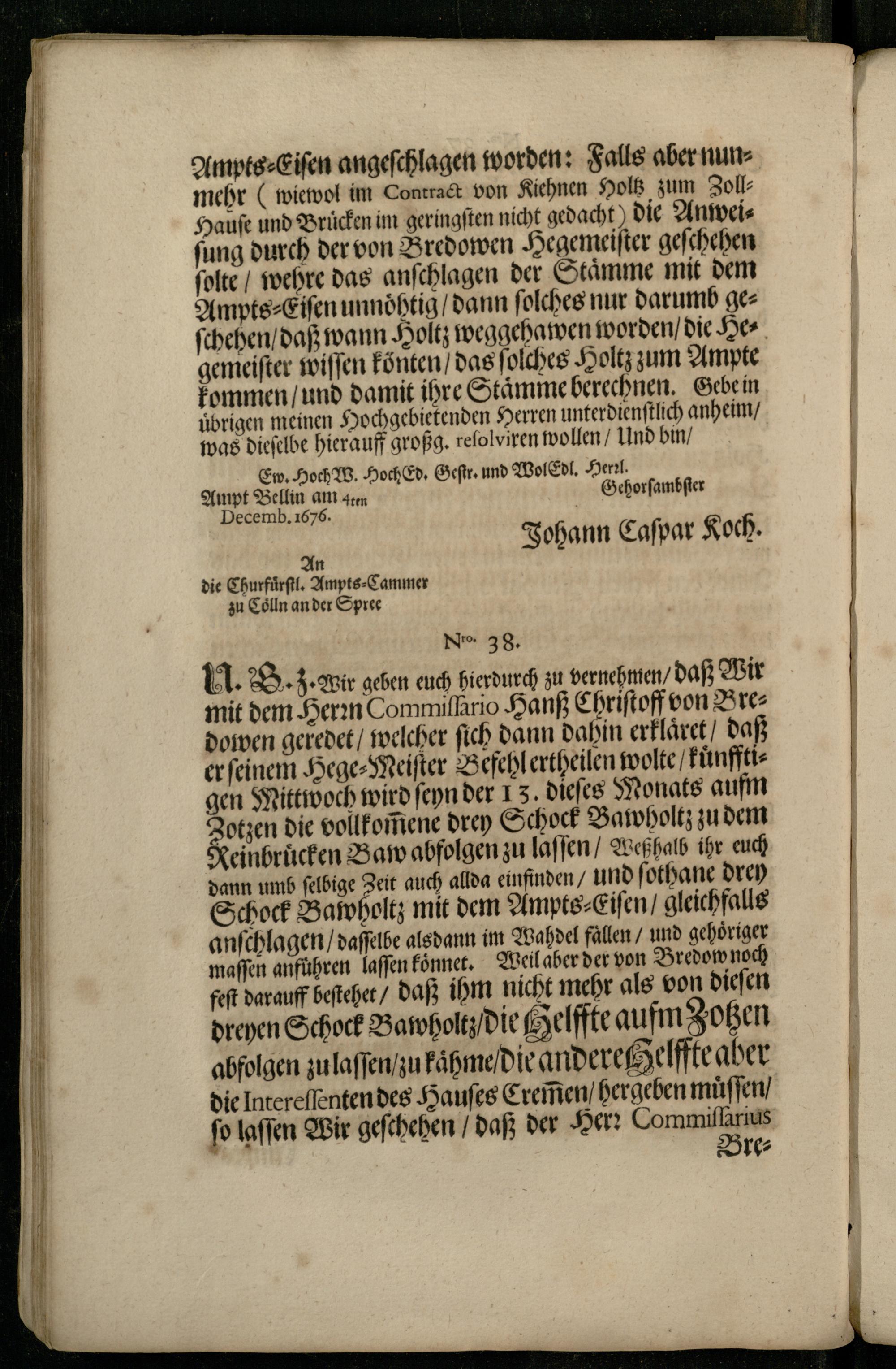 U. D. z. Wir geben euch hierdurch zu vernehmen/ daß Wir mit dem Herꝛn Commiſſario Hanß Chriſtoff von Bredowen geredet/ welcher ſich dann dahin erklaͤret/ daß er ſeinem Hege⸗Meiſter Befehlertheilen wolte/ kuͤnfftigen Mittwoch wird ſeyn der 15. dieſes Monats aufm 5 die vollkom̃ene drey Schock Bawholtz zu dem einbruͤcken Baw abfolgen zu laſſen/ Weßhalb ihr euch dann umb ſelbige Zeit auch allda einfinden/ UND ſothane drey Schock Bawholtz mit dem Ampts⸗Eiſen/ gleichfalls anſchlagen/ daſſelbe alsdann im Wahdel fallen/ und gehoͤriger maſſen anführen laffen koͤnnet. Weil aber der von Bredow noch feſt darauff beſtehet/ Daß ihm nicht mehr als von dieſen dreyen Schock Bawholtz die Helffte aufm Zotzen abfolgen zu laſſen zu kaͤhme/ die andereſZelffte aber die Intereſſenten des Hauſes Crem̃en hergeben muͤſſen/ fo laſſen Wir geſchehen/ daß der Herr eee re