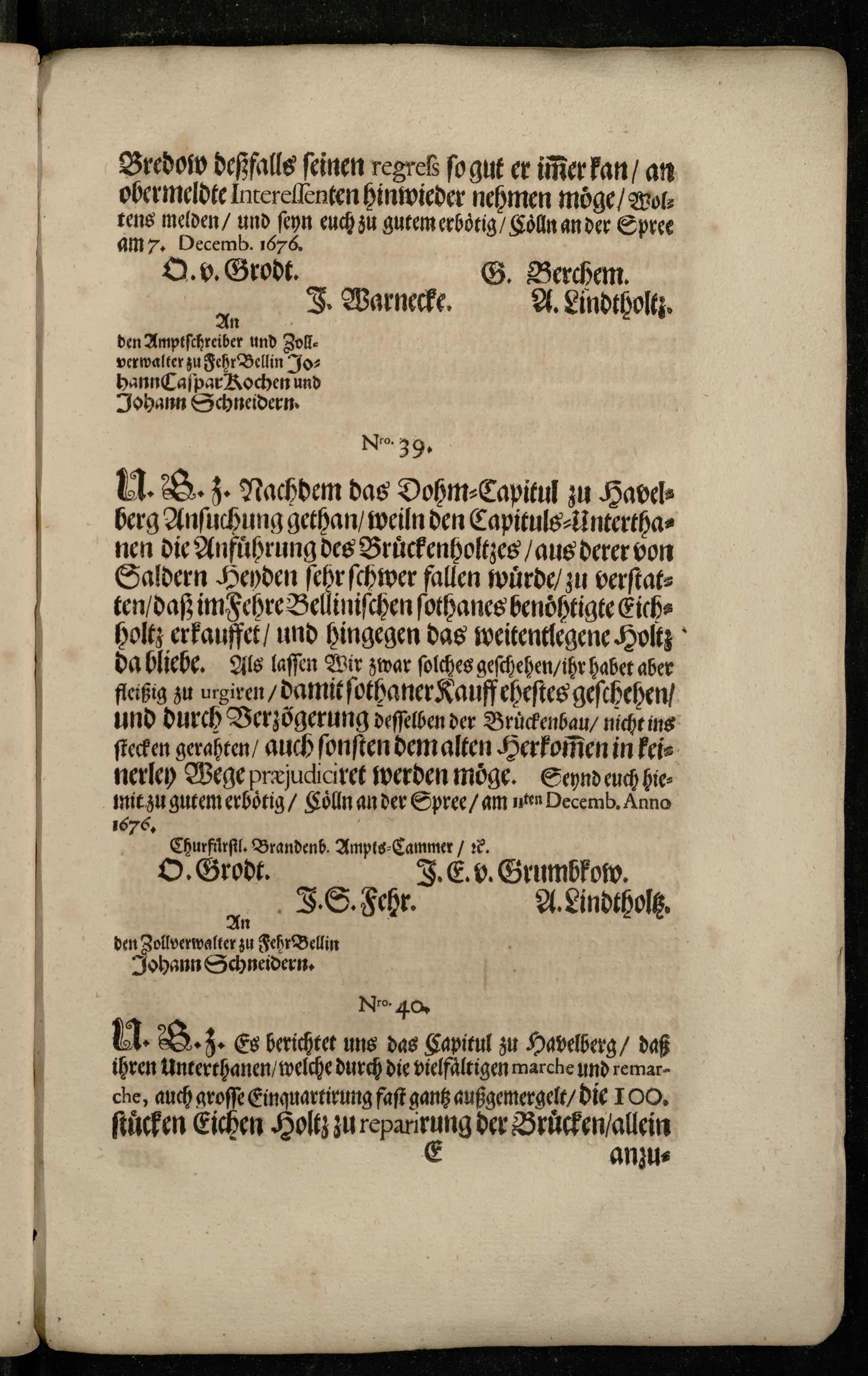 O. Grodt. J. E. v. Grumbkoſo. J. S. Fehr. A. Lindtholtz. den Zollverwalter zu Fehr Bellin; Johann Schneidern. Niro. 40.