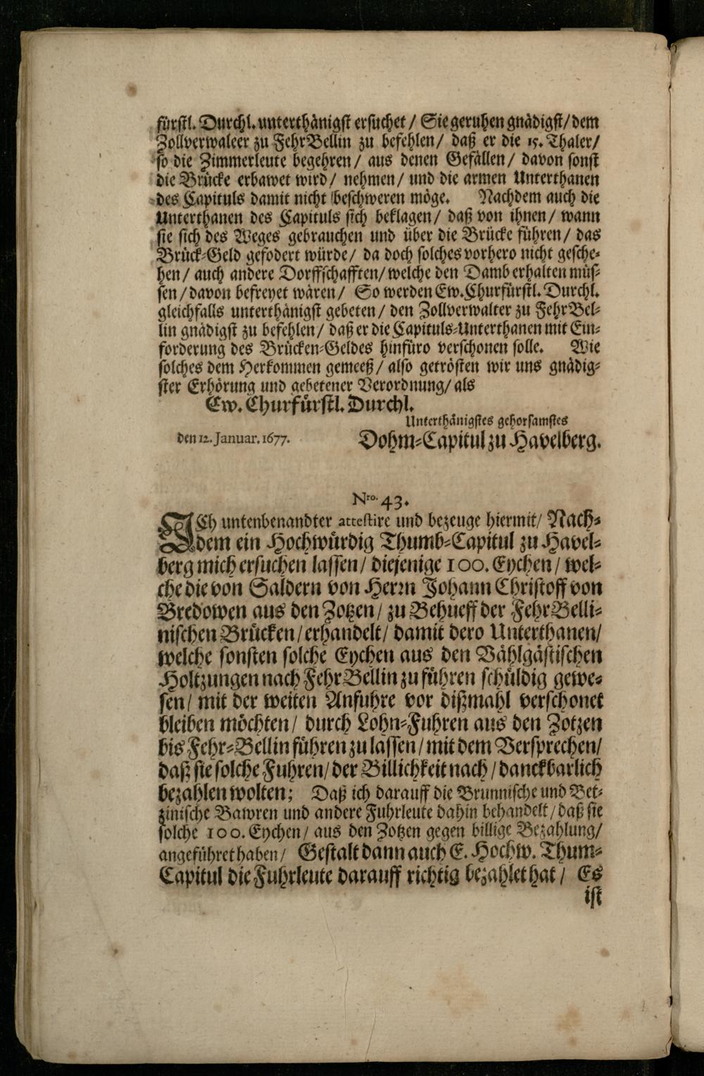 Ew. Churfuͤrſtl. Durchl. Unterthaͤnigſtes geßorſamſtes den 12. Januar. 1677. Dohm⸗Capitul zu Havelberg. Ns 43.