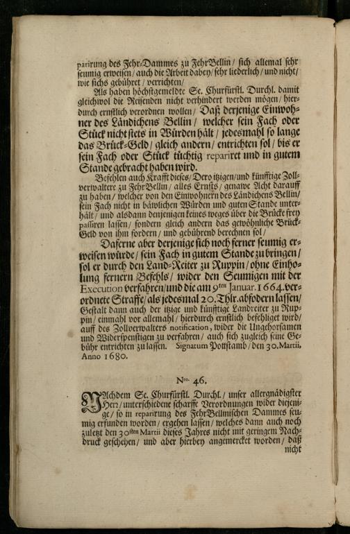 parirung des Fehr⸗Dammes zu Fehr Bellin/ ſich allemal ſehr ſeumig erweisen/ auch die Arbeit dabey/ ſehr liederlich/ und nicht/ wie ſichs gebuͤhret/ verrichten/|. Als haben hoͤchſtgemeldte Se. Churfürſtl. Durchl. damit gleichwol die Reiſenden nicht verhindert werden moͤgen/ hierdurch ernſtlich verordnen wollen/ Daß derjenige Einwohner des Laͤndichens Bellin/ welcher ſein Fach oder Stuͤck nicht ſtets in Wuͤrden hält/ jedes mahl fo lange das Bruͤck⸗Geld gleich andern/ entrichten ſol/ bis er fein Fach oder Stück tuͤchtig repariret und in gutem Stande gebracht haben wird.| Befehlen auch Krafft dieſes/ Dero itzigen/ und Fünfftige Zollverwaltere zu Fehr Bellin/ alles Ernſts/ genawe Acht darauff 10 haben/ welcher von den Einwohnern des Laͤndichens Bellin/ ein Fach nicht in baͤvlichen Würden und guten Stande unterhalt/ und alsdann denjenigen keines weges über die Bruͤcke frey paſſiren laſſen/ ſondern gleich andern das gewoͤhnliche BrückGeld von ihm fordern/ und gebuͤhrend berechnen ſol /// Daferne aber derjenige ſich noch ferner ſeumig erweiſen wurde/ fein Fach in gutem Stande zu bringen/ ſol er durch den Land⸗Reiter zu Ruppin/ ohne Einholung fernern Befehls/ wider den Seumigen mit der Execution verfahren/ und die am* Januar. 1664. verordnete Straffe/ als jedes mal 20. Thlr. abfodern laſſen/ Geſtalt dann auch der itzige und kuͤnfftige Landreiter zu Ruppin/ einmahl vor allemahl/ hierdurch ernſtlich befehliget wird auff des Zollverwalters notification, wider die Ungehorſamen und Widerſpenſtigen zu verfahren/ auch ſich zugleich ſeine Gebuͤhr 1 zu laſſen. Signatum Pottſtamb/ den 30. Martii, Anno 1680.
