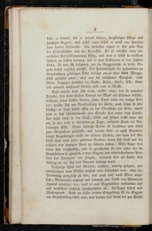 | und anderes nutzbares Gehoͤlz wild und in Maſſe. wuͤrde man ſich irren, wollte man, wie ſo mancher / Fremde, den beim bloßen Nennen der Mark ein Schauer befaͤllt, waͤhnen, jener leichte Boden, jener Sand wäre die einzige Erdart, welche ſich um Brandenburg her faͤnde; auch Lehm iſt ſehr | Häufig: er liegt theils offen an der Oberflaͤche der Erde, theils . zieht er ſich ſchichtenweiſe eine Strecke fort unter dem Sande. Und nicht bloß in der Tiefe, ſelbſt auf Höhen trifft man ihn tritt er bisweilen zu Tage, während Sand die Nie— Dieſer lehmige Boden iſt fruchtbar und ſelbſt