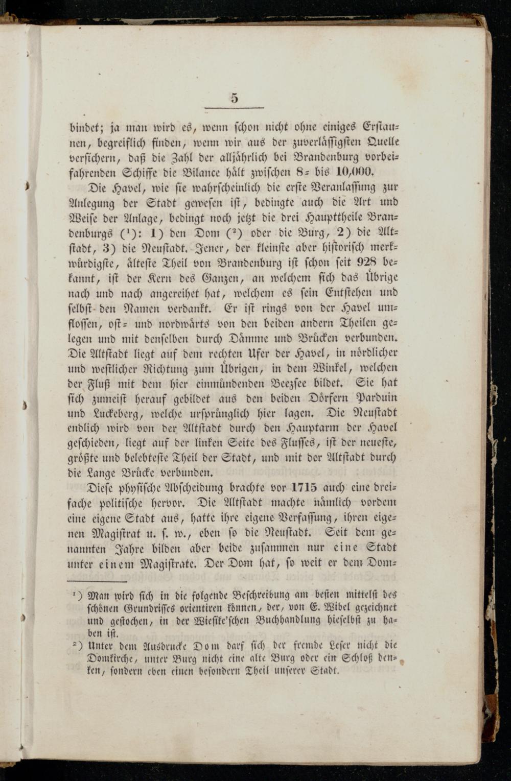 Die Havel, wie ſie wahrſcheinlich die erſte Veranlaſſung zur Anlegung der Stadt geweſen iſt, bedingte auch die Art und Weiſe der Anlage, bedingt noch jetzt die drei Haupttheile Branz denburgs(i): 1) den Dom(2) oder die Burg, 2) die Altſtadt, 3) die Neuſtadt. Jener, der kleinſte aber hiſtoriſch merk— wuͤrdigſte, aͤlteſte Theil von Brandenburg iſt ſchon ſeit 928 bekannt, iſt der Kern des Ganzen, an welchem ſich das uͤbrige nach und nach angereihet hat, welchem es ſein Entſtehen und ſelbſt den Namen verdankt. Er iſt rings von der Havel um— floſſen, oſt- und nordwaͤrts von den beiden andern Theilen ge— legen und mit denſelben durch Damme und Brücken verbunden. Die Altſtadt liegt auf dem rechten Ufer der Havel, in noͤrdlicher und weſtlicher Richtung zum Übrigen, in dem Winkel, welchen der Fluß mit dem hier einmuͤndenden Beezſee bildet. Sie hat ſich zumeiſt herauf gebildet aus den beiden Dörfern Parduin und Luckeberg, welche urſpruͤnglich hier lagen. Die Neuſtadt endlich wird von der Altſtadt durch den Hauptarm der Havel geſchieden, liegt auf der linken Seite des Fluſſes, iſt der neueſte, groͤßte und belebteſte Theil der Stadt, und mit der Altſtadt durch die Lange Brücke verbunden.
