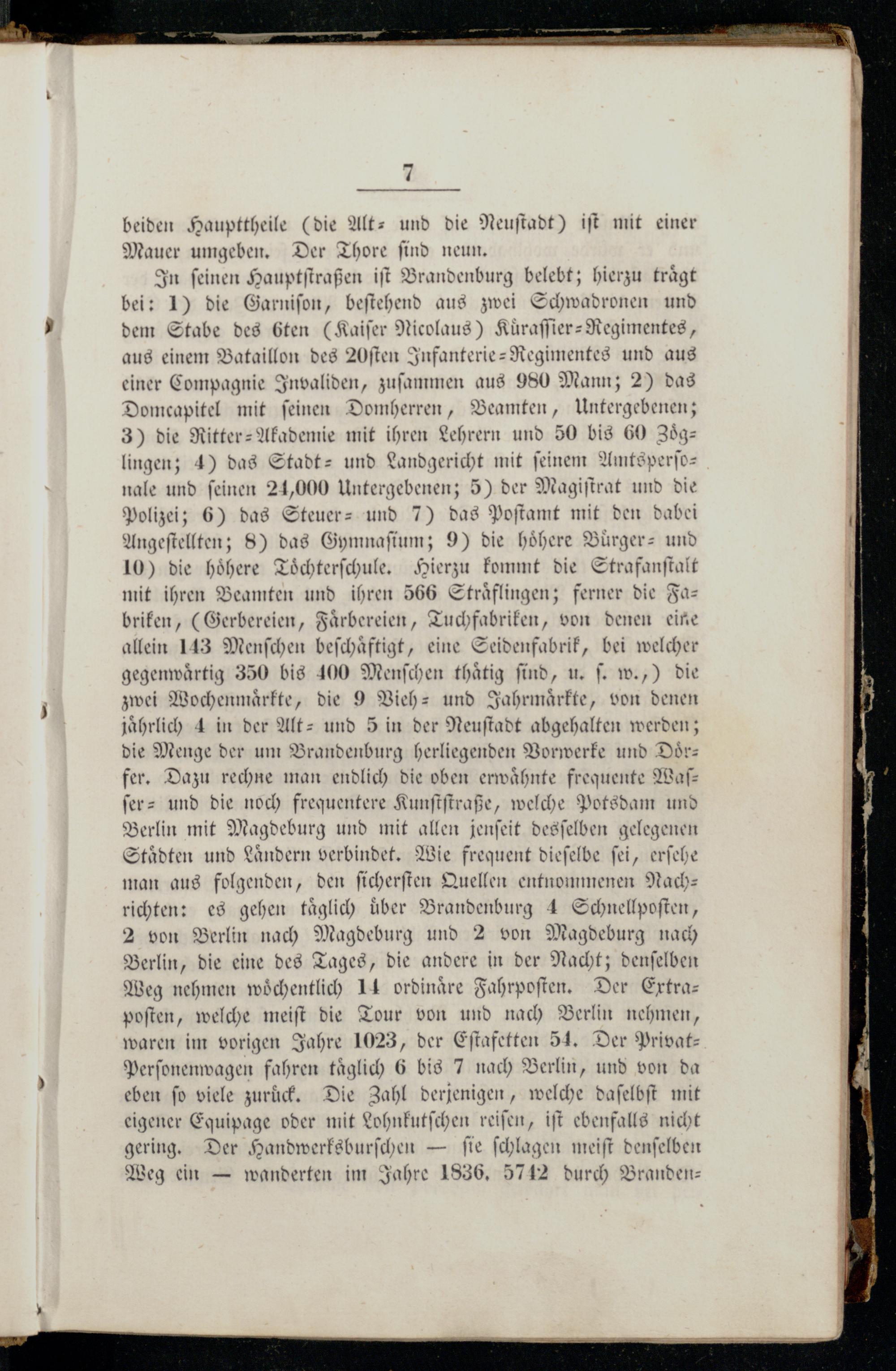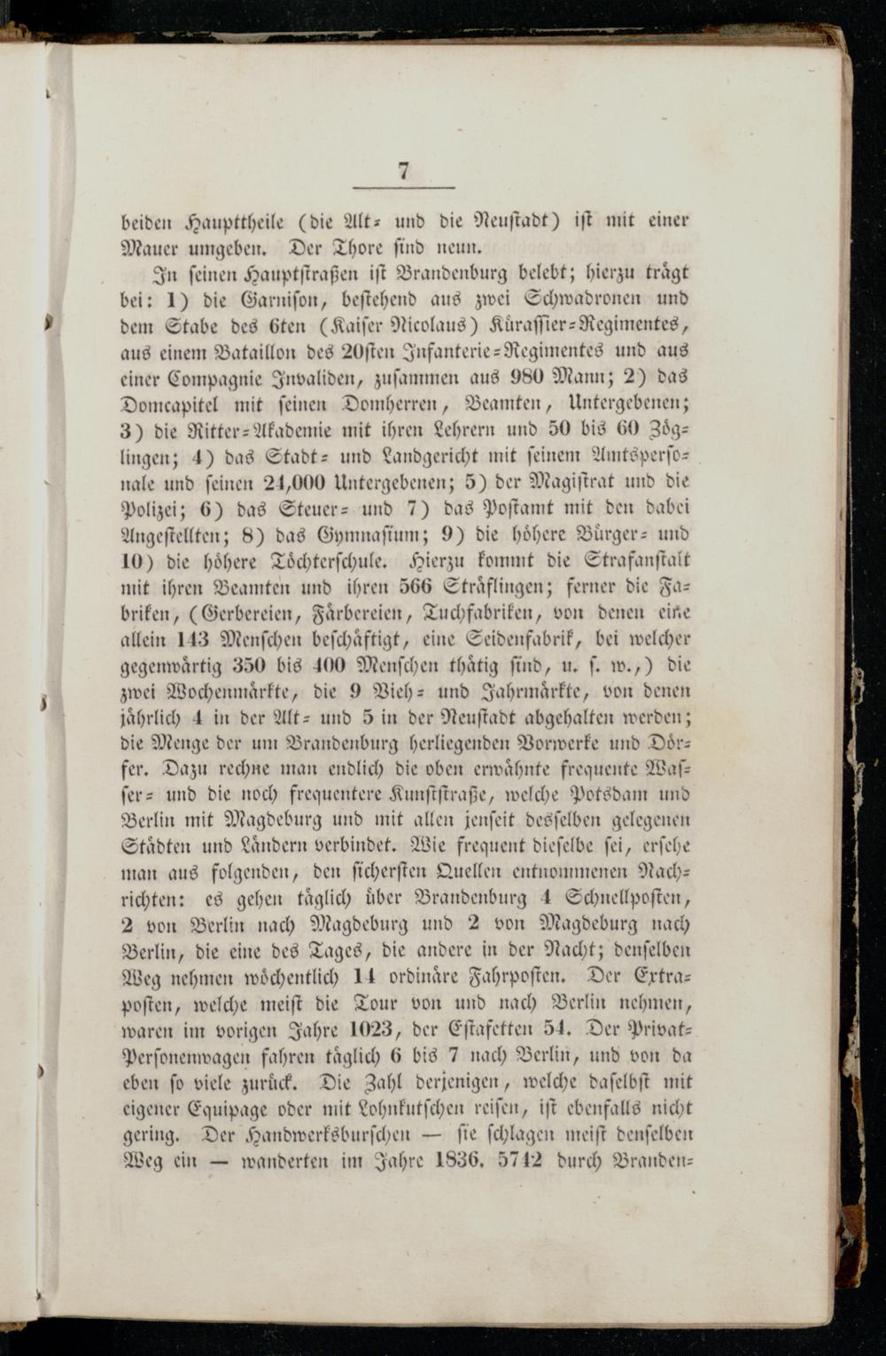 In ſeinen Hauptſtraßen iſt Brandenburg belebt; hierzu traͤgt bei: 1) die Garniſon, beſtehend aus zwei Schwadronen und dem Stabe des 6ten(Kaiſer Nicolaus) Kuͤraſſier-Regimentes, aus einem Bataillon des 20ſten Infanterie-Regimentes und aus einer Compagnie Invaliden, zuſammen aus 980 Mann; 2) das Domcapitel mit feinen Domherren, Beamten, Untergebenen; 3) die Ritter-Akademie mit ihren Lehrern und 50 bis 60 Zoͤg—lingen; 4) das Stadt- und Landgericht mit ſeinem Amtsperſonale und ſeinen 21,000 Untergebenen; 5) der Magiſtrat und die Polizei; 6) das Steuer- und 7) das Poſtamt mit den dabei Angeſtellten; 8) das Gymnaſium; 9) die höhere Buͤrger- und 10) die höhere Toͤchterſchule. Hierzu kommt die Strafanſtalt mit ihren Beamten und ihren 566 Straͤflingen; ferner die Fabriken,(Gerbereien, Faͤrbereien, Tuchfabriken, von denen eine allein 143 Menſchen beſchaͤftigt, eine Seidenfabrik, bei welcher gegenwärtig 350 bis 100 Menſchen thaͤtig find, u. ſ. w.,) die zwei Wochenmaͤrkte, die 9 Vieh- und Jahrmaͤrkte, von denen jährlich 4 in der Alt- und 5 in der Neuſtadt abgehalten werden; die Menge der um Brandenburg herliegenden Vorwerke und Doͤrfer. Dazu rechne man endlich die oben erwaͤhnte frequente Waſ⸗— ſer- und die noch frequentere Kunſtſtraße, welche Potsdam und Berlin mit Magdeburg und mit allen jenſeit desſelben gelegenen Staͤdten und Laͤndern verbindet. Wie frequent dieſelbe ſei, erſehe man aus folgenden, den ſicherſten Quellen entnommenen Nach: richten: es gehen taͤglich über Brandenburg 4 Schnellpoſten, 2 von Berlin nach Magdeburg und 2 von Magdeburg nach Berlin, die eine des Tages, die andere in der Nacht; denſelben Weg nehmen wöchentlich 14., Der Extra—poſten, welche meiſt die Tour von und nach Berlin nehmen, waren im vorigen Jahre 1023, der Eſtafetten 54. Der PrivatPerſonenwagen fahren täglich 6 bis 7 nach Berlin, und von da eben fo viele zurück, Die Zahl derjenigen, welche daſelbſt mit eigener Equipage oder mit Lohnkutſchen reifen, iſt ebenfalls nicht gering. Der Handwerksburſchen— ſie ſchlagen meiſt denſelben Weg ein— wanderten im Jahre 1836. 5742 durch Branden—