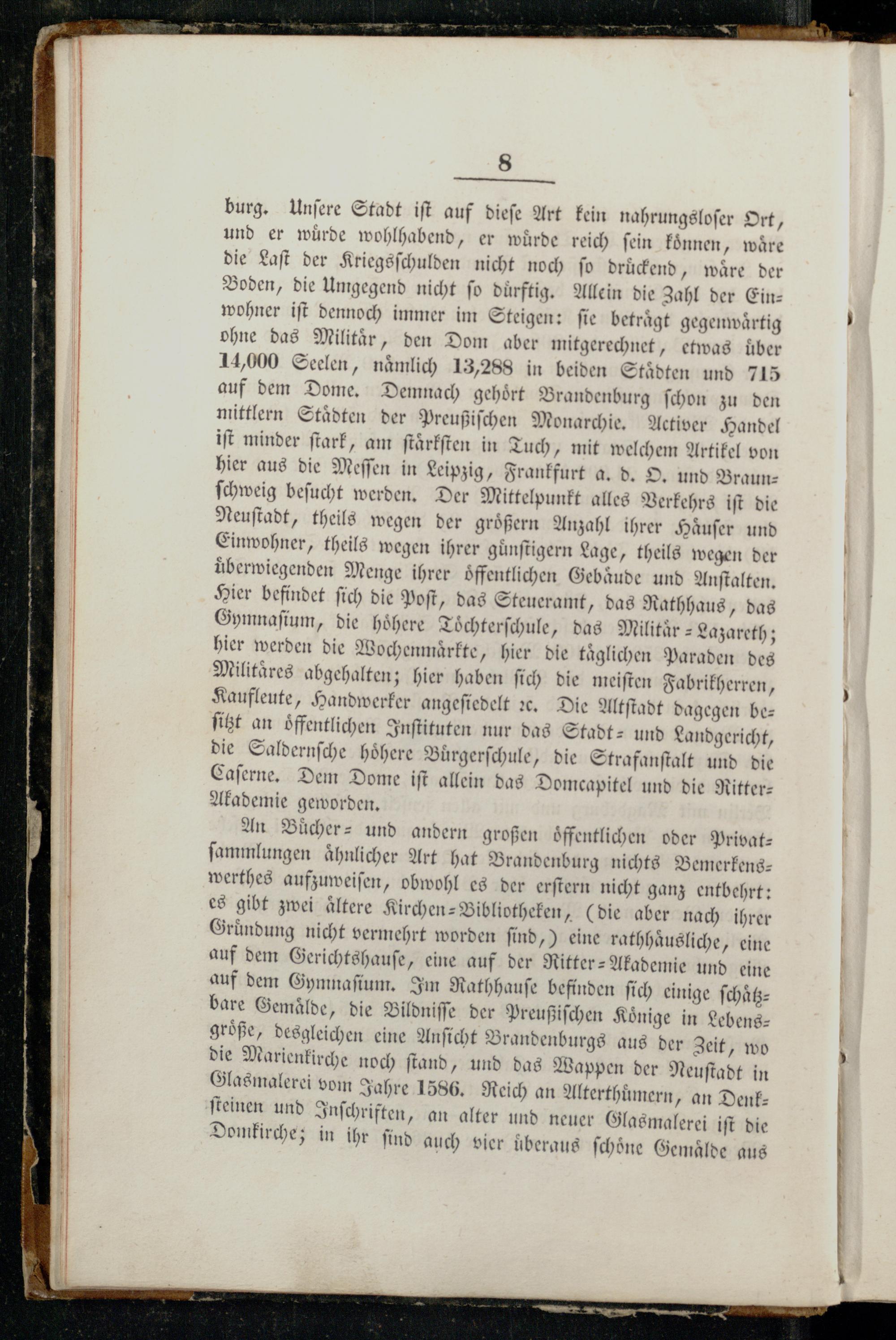 ohne das Militaͤr, den Dom aber mitgerechnet, etwas über 14,000 Seelen, naͤmlich 13,288 in beiden Staͤdten und 715 auf dem Dome. Demnach gehört Brandenburg ſchon zu den mittlern Staͤdten der Preußiſchen Monarchie. Activer Handel iſt minder ſtark, am ſtaͤrkſten in Tuch, mit welchem Artikel von hier aus die Meſſen in Leipzig, Frankfurt a. d. D. und Braunſchweig beſucht werden. Der Mittelpunkt alles Verkehrs iſt die Neuſtadt, theils wegen der groͤßern Anzahl ihrer Haͤuſer und Einwohner, theils wegen ihrer guͤnſtigern Lage, theils wegen der uͤberwiegenden Menge ihrer offentlichen Gebäude und Anſtalten. Hier befindet ſich die Poſt, das Steueramt, das Rathhaus, das Gymnaſium, die höhere Toͤchterſchule, das Militär= Lazareth; hier werden die Wochenmaͤrkte, hier die taͤglichen Paraden des Militaͤres abgehalten; hier haben ſich die meiſten Fabrikherren, Kaufleute, Handwerker angeſiedelt ꝛc. Die Altſtadt dagegen bez