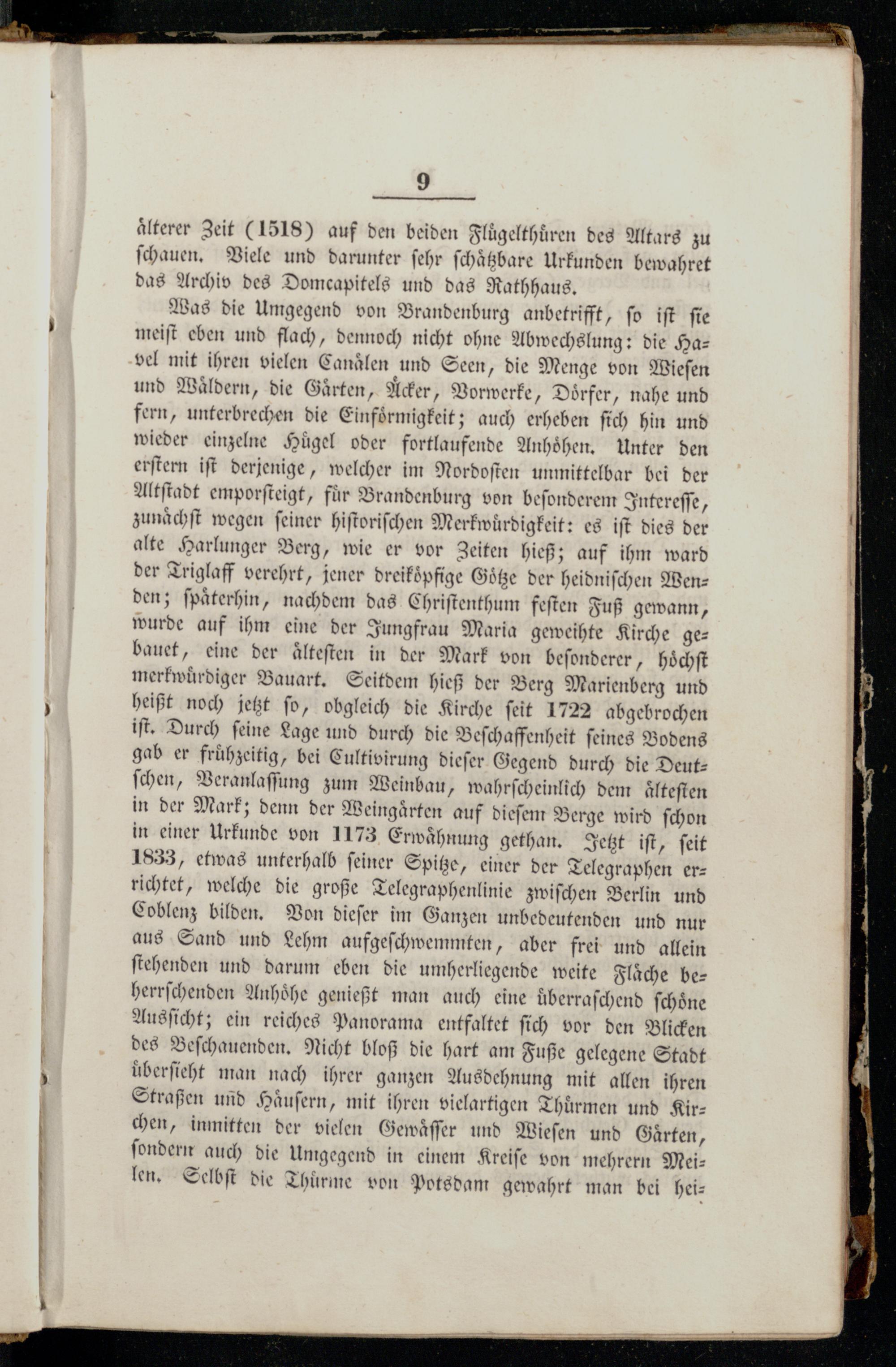 Was die Umgegend von Brandenburg anbetrifft, ſo iſt ſie meiſt eben und flach, dennoch nicht ohne Abwechslung: die Havel mit ihren vielen Canaͤlen und Seen, die Menge von Wieſen und Waͤldern, die Gaͤrten, Acker, Vorwerke, Dörfer, nahe und fern, unterbrechen die Einfoͤrmigkeit; auch erheben ſich hin und wieder einzelne Hügel oder fortlaufende Anhoͤhen. Unter den erſtern iſt derjenige, welcher im Nordoſten unmittelbar bei der Altſtadt emporſteigt, fuͤr Brandenburg von beſonderem Intereſſe, zunaͤchſt wegen ſeiner hiſtoriſchen Merkwurdigkeit: es iſt dies der alte Harlunger Berg, wie er vor Zeiten hieß; auf ihm ward der Triglaff verehrt, jener dreiköpfige Göße der heidniſchen Wen— den; ſpaͤterhin, nachdem das Chriſtenthum feſten Fuß gewann, wurde auf ihm eine der Jungfrau Maria geweihte Kirche gebauet, eine der aͤlteſten in der Mark von beſonderer, hoͤchſt merkwürdiger Bauart. Seitdem hieß der Berg Marienberg und heißt noch jetzt ſo, obgleich die Kirche ſeit 1722 abgebrochen iſt. Durch ſeine Lage und durch die Beſchaffenheit ſeines Bodens gab er fruͤhzeitig, bei Cultivirung dieſer Gegend durch die Deutſchen, Veranlaſſung zum Weinbau, wahrſcheinlich dem aͤlteſten in der Mark; denn der Weingaͤrten auf dieſem Berge wird ſchon in einer Ukunde von 1173 Erwaͤhnung gethan. Jetzt iſt, ſeit 1833, etwas unterhalb ſeiner Spitze, einer der Telegraphen errichtet, welche die große Telegraphenlinie zwiſchen Berlin und Coblenz bilden. Von dieſer im Ganzen unbedeutenden und nur aus Sand und Lehm aufgeſchwemmten, aber frei und allein ſtehenden und darum eben die umherliegende weite Flaͤche beherrſchenden Anhoͤhe genießt man auch eine üͤberraſchend ſchoöne Ausſicht; ein reiches Panorama entfaltet ſich vor den Blicken des Beſchauenden. Nicht bloß die hart am Fuße gelegene Stadt überſieht man nach ihrer ganzen Ausdehnung mit allen ihren Straßen und Haͤuſern, mit ihren vielartigen Thuͤrmen und Kir— chen, inmitten der vielen Gewaͤſſer und Wieſen und Gaͤrten, ſondern auch die Umgegend in einem Kreiſe von mehrern Mei: len. Selbſt die Thuͤrme von Potsdam gewahrt man bei hei