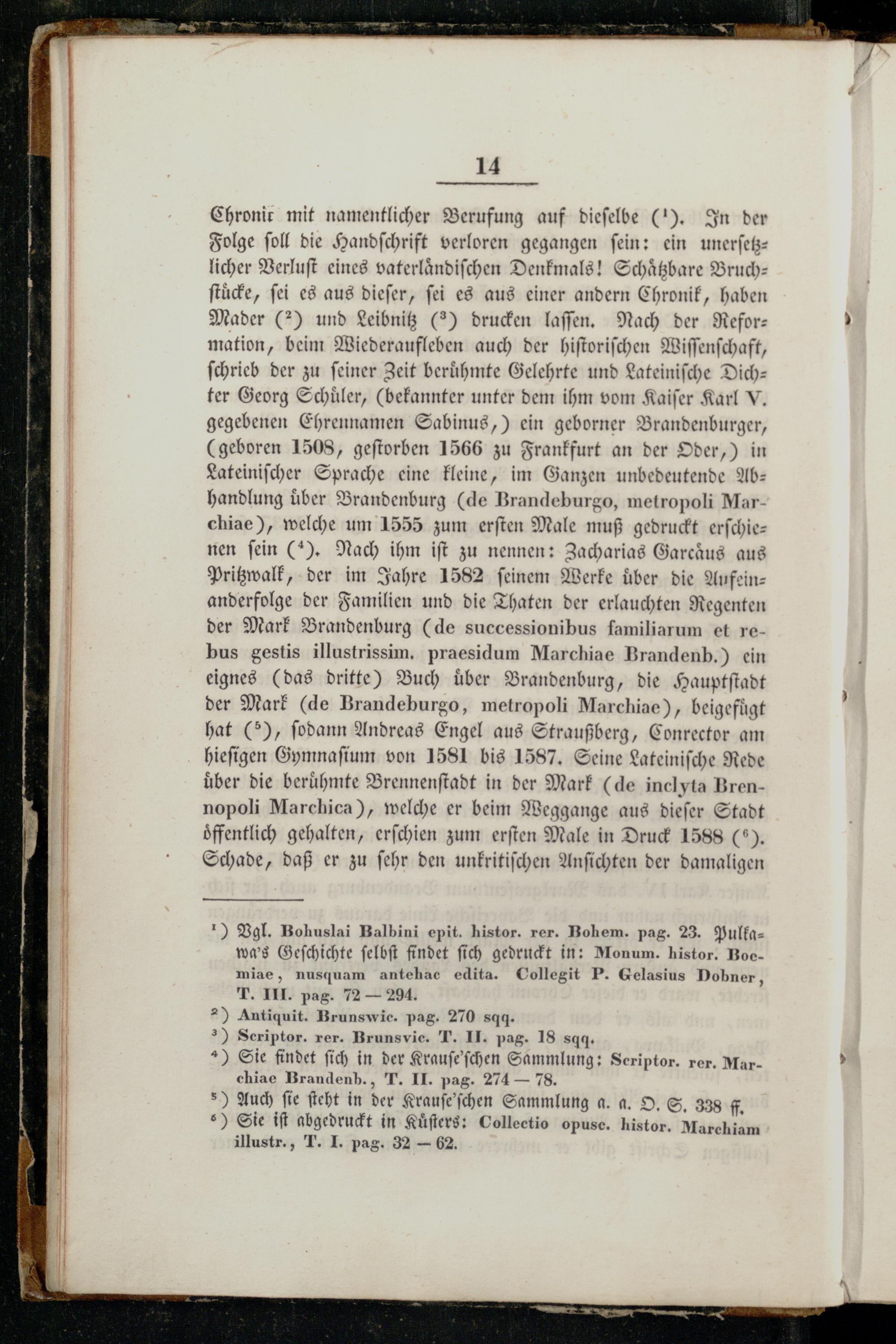 Chronit mit namentlicher Berufung auf dieſelbe(1). In der Folge ſoll die Handſchrift verloren gegangen fein: ein unerſetzlicher Verluſt eines vaterlaͤndiſchen Denkmals! Schaͤtzbare Bruch: ſtuͤcke, ſei es aus dieſer, ſei es aus einer andern Chronik, haben Mader(2) und Leibnitz(2) drucken laſſen. Nach der Refor— mation, beim Wiederaufleben auch der hiſtoriſchen Wiſſenſchaft, ſchrieb der zu feiner Zeit beruͤhmte Gelehrte und Lateiniſche Dichter Georg Schuͤler,(bekannter unter dem ihm vom Kaiſer Karl V. gegebenen Ehrennamen Sabinus,) ein geborner Brandenburger, (geboren 1508, geſtorben 1566 zu Frankfurt an der Oder,) in Lateiniſcher Sprache eine kleine, im Ganzen unbedeutende Ab— handlung über Brandenburg(de Brandeburgo, metropoli Marchiae), welche um 1555 zum erſten Male muß gedruckt erſchienen fein(). Nach ihm iſt zu nennen: Zacharias Garcaͤus aus Pritzwalk, der im Jahre 1582 feinen Werke über die Aufein— anderfolge der Familien und die Thaten der erlauchten Regenten der Mark Brandenburg(de successionibus familiarum et rebus gestis illustrissim. praesidum Marchiae Brandenb.) ein eignes(das dritte) Buch uͤber Brandenburg, die Hauptſtadt der Mark(de Brandehurgo, metropoli Marchiae), beigefügt hat(), ſodann Andreas Engel aus Straußberg, Conrector am hieſigen Gymnaſium von 1581 bis 1587. Seine Lateiniſche Rede über die berühmte Brennenſtadt in der Mark(de inclyta Brennopoli Marchica), welche er beim Weggange aus dieſer Stadt öffentlich gehalten, erſchien zum erſten Male in Druck 1588(). Schade, daß er zu ſehr den unkritiſchen Anſichten der damaligen