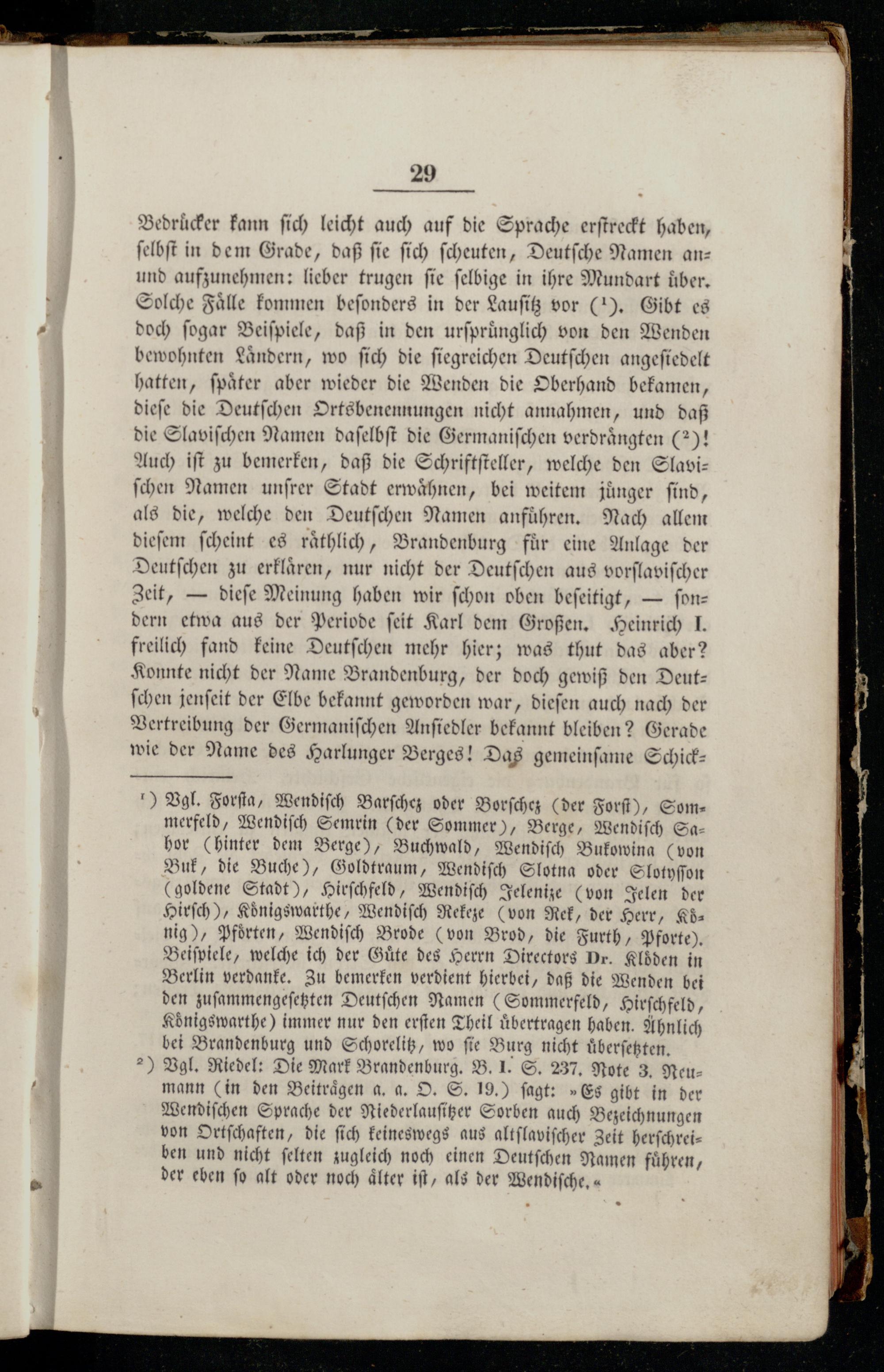 ) Vgl. Riedel: Die Mark Brandenburg. B. J. S. 237. Note 3. Neumann(Cin den Beiträgen a. 4. O. S. 19.) ſagt:„»Es gibt in der Wendiſchen Sprache der Niederlauſitzer Sorben auch Bezeichnungen von Ortſchaften, die ſich keineswegs aus altſlaviſcher Zeit herſchreiben und nicht ſelten zugleich noch einen Deutſchen Namen führen, der eben ſo alt oder noch aͤlter iſt, als der Wendiſche.«