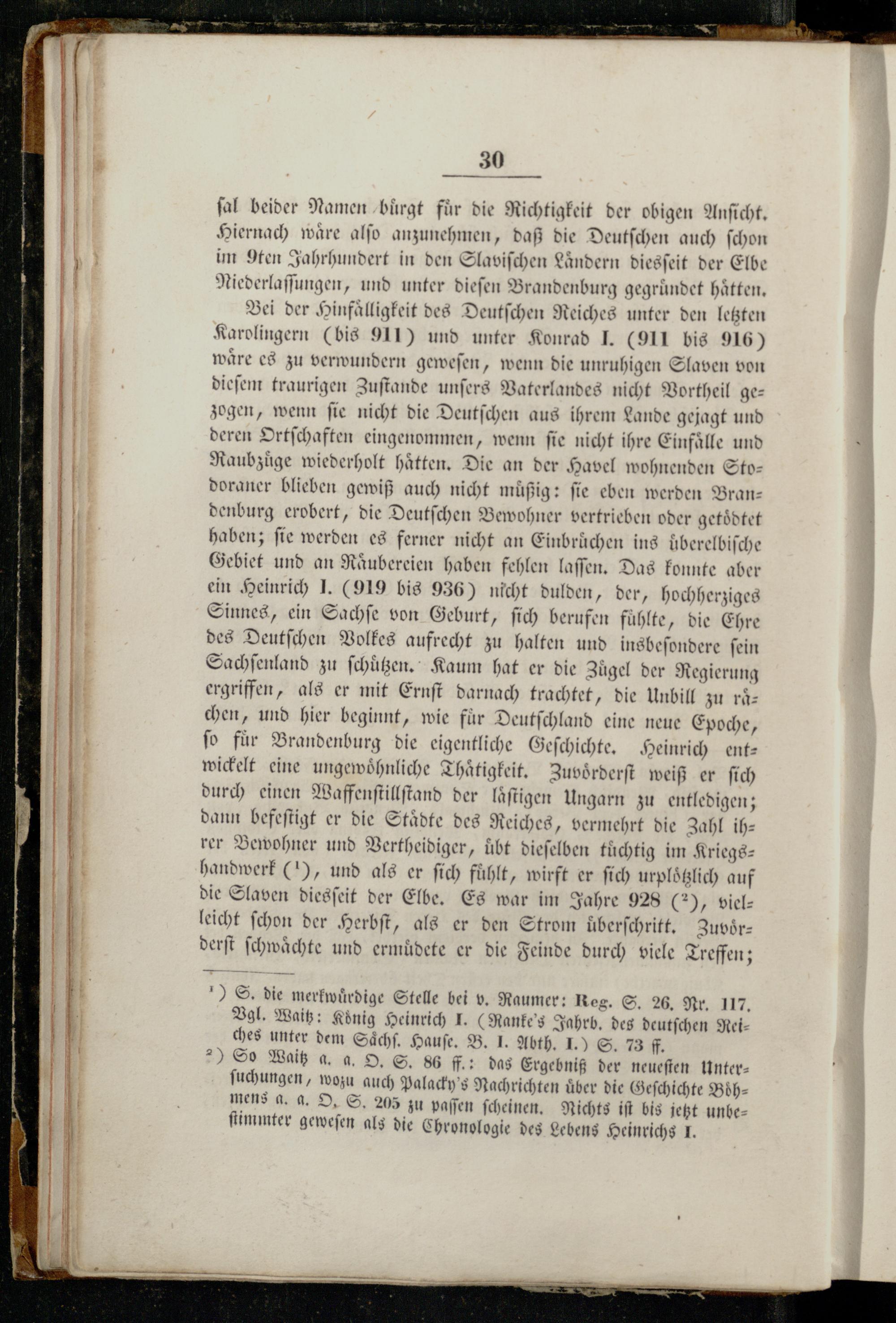 Bei der Hinfaͤlligkeit des Deutſchen Reiches unter den letzten Karolingern(bis 911) und unter Konrad J.(911 bis 916) waͤre es zu verwundern geweſen, wenn die unruhigen Slaven von dieſem traurigen Zuſtande unſers Vaterlandes nicht Vortheil gezogen, wenn ſie nicht die Deutſchen aus ihrem Lande gejagt und deren Ortſchaften eingenommen, wenn ſie nicht ihre Einfälle und Raubzige wiederholt hätten, Die an der Havel wohnenden Stodoraner blieben gewiß auch nicht muͤßig: fie eben werden Bran— denburg erobert, die Deutſchen Bewohner vertrieben oder getoͤdtet haben; ſie werden es ferner nicht an Einbruͤchen ins uͤberelbiſche Gebiet und an Raͤubereien haben fehlen laſſen. Das konnte aber ein Heinrich J.(919 bis g36) nicht dulden, der, hochherziges Sinnes, ein Sachſe von Geburt, ſich berufen fühlte, die Ehre des Deutſchen Volkes aufrecht zu halten und insbeſondere ſein Sachſenland zu ſchuͤtzen. Kaum hat er die Zügel der Regierung ergriffen, als er mit Ernſt darnach trachtet, die Unbill zu raͤ— chen, und hier beginnt, wie für Deutſchland eine neue Epoche, ſo fuͤr Brandenburg die eigentliche Geſchichte. Heinrich entwickelt eine ungewöhnliche Thaͤtigkeit. Zuvoͤrderſt weiß er ſich durch einen Waffenſtillſtand der laͤſiigen Ungarn zu entledigen; dann befeſtigt er die Staͤdte des Reiches, vermehrt die Zahl ih— rer Bewohner und Vertheidiger, übt dieſelben tüchtig im Kriegshandwerk(1), und als er ſich fuͤhlt, wirft er ſich urploͤtzlich auf die Slaven diesſeit der Elbe. Es war im Jahre 928(2), vielleicht ſchon der Herbſt, als er den Strom uͤberſchritt. Zuvoͤr—