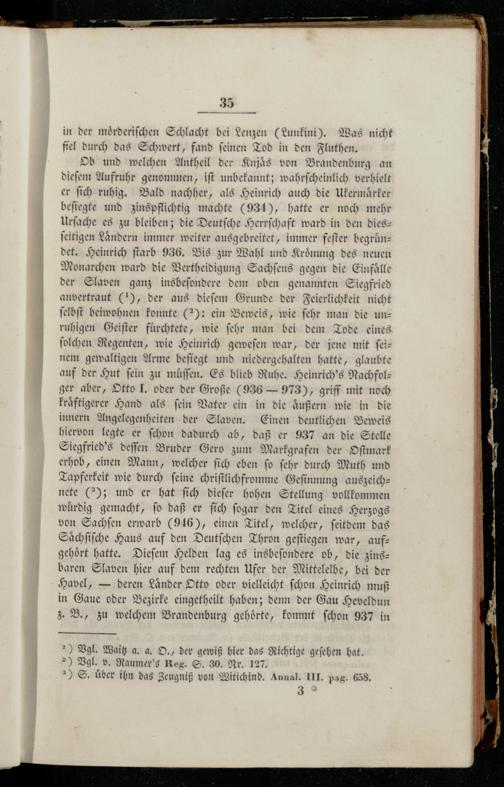 Ob und welchen Antheil der Knjaͤs von Brandenburg an dieſem Aufruhr genommen, iſt unbekannt; wahrſcheinlich verhielt er ſich ruhig. Bald nachher, als Heinrich auch die Ukermaͤrker beſiegte und zinspflichtig machte(934), hatte er noch mehr Urſache es zu bleiben; die Deutſche Herrſchaft ward in den dies: ſeitigen Landern immer weiter ausgebreitet, immer feſter begruͤndet. Heinrich ſtarb 936. Bis zur Wahl und Kroͤnung des neuen Monarchen ward die Vertheidigung Sachſens gegen die Einfaͤlle der Slaven ganz insbeſondere dem oben genannten Siegfried anvertraut(1), der aus dieſem Grunde der Feierlichkeit nicht ſelbſt beiwohnen konnte(2): ein Beweis, wie ſehr man die un— ruhigen Geiſter fuͤrchtete, wie ſehr man bei dem Tode eines ſolchen Regenten, wie Heinrich geweſen war, der jene mit feiz nem gewaltigen Arme beſiegt und niedergehalten hatte, glaubte auf der Hut fein zu muͤſſen. Es blieb Ruhe. Heinrich's Nachfol⸗— ger aber, Otto J. oder der Große(936— 973), griff mit noch kraͤftigerer Hand als fein Vater ein in die äußern wie in die innern Angelegenheiten der Slaven. Einen deutlichen Beweis hiervon legte er ſchon dadurch ab, daß er 937 an die Stelle Siegfried's deſſen Bruder Gero zum Markgrafen der Oſtmark erhob, einen Mann, welcher ſich eben ſo ſehr durch Muth und Tapferkeit wie durch ſeine chriſtlichfromme Geſinnung auszeichnete(2); und er hat ſich dieſer hohen Stellung vollkommen wuͤrdig gemacht, fo daß er ſich ſogar den Titel eines Herzogs von Sachſen erwarb(946), einen Titel, welcher, ſeitdem das Saͤchſiſche Haus auf den Deutſchen Thron geſtiegen war, aufgehört hatte. Dieſem Helden lag es insbeſondere ob, die zins—baren Slaven hier auf dem rechten Ufer der Mittelelbe, bei der Havel,— deren Laͤnder Otto oder vielleicht ſchon Heinrich muß in Gaue oder Bezirke eingetheilt haben; denn der Gau Heveldun z. B., zu welchem Brandenburg gehoͤrte, kommt ſchon 937 in