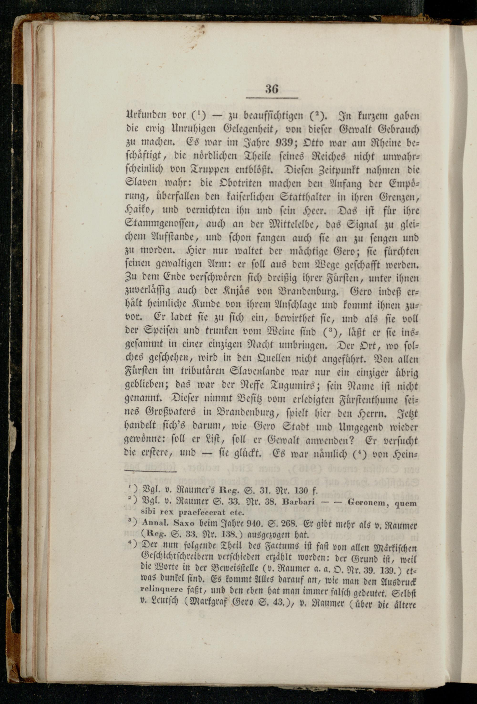 Urkunden vor(i)— zu beaufſichtigen(2). In kurzem gaben die ewig Unruhigen Gelegenheit, von dieſer Gewalt Gebrauch zu machen. Es war im Jahre 939; Otto war am Rheine be— ſchaͤftigt, die noͤrdlichen Theile ſeines Reiches nicht unwahr— ſcheinlich von Truppen entbloͤßt. Dieſen Zeitpunkt nahmen die Slaven wahr: die Obotriten machen den Anfang der Empoͤ— rung, überfallen den kaiſerlichen Statthalter in ihren Grenzen, Haiko, und vernichten ihn und fein Heer. Das iſt für ihre Stammgenoſſen, auch an der Mittelelbe, das Signal zu gleichem Aufſtande, und ſchon fangen auch ſie an zu ſengen und zu morden. Hier nur waltet der mächtige Gero; fie fürchten ſeinen gewaltigen Arm: er ſoll aus dem Wege geſchafft werden. Zu dem Ende verſchwoͤren ſich dreißig ihrer Fürſten, unter ihnen zuverlaͤſſig auch der Knjaͤs von Brandenburg. Gero indeß erhaͤlt heimliche Kunde von ihrem Anſchlage und kommt ihnen zuvor. Er ladet ſie zu ſich ein, bewirthet ſie, und als ſie voll der Speiſen und trunken vom Weine find(a), läßt er fie ins— geſammt in einer einzigen Nacht umbringen. Der Ort, wo ſolches geſchehen, wird in den Quellen nicht angeführt. Von allen Fuͤrſten im tributaͤren Slavenlande war nur ein einziger übrig geblieben; das war der Neffe Tugumirs; ſein Name iſt nicht genannt. Dieſer nimmt Beſitz vom erledigten Fuͤrſtenthume ſeines Großvaters in Brandenburg, ſpielt hier den Herrn. Jetz handelt ſich's darum, wie Gero Stadt und Umgegend wieder gewoͤnne: ſoll er Liſt, ſoll er Gewalt anwenden? Er verſucht die erſtere, und— fie gluͤckt. Es war nämlich() von Heinz