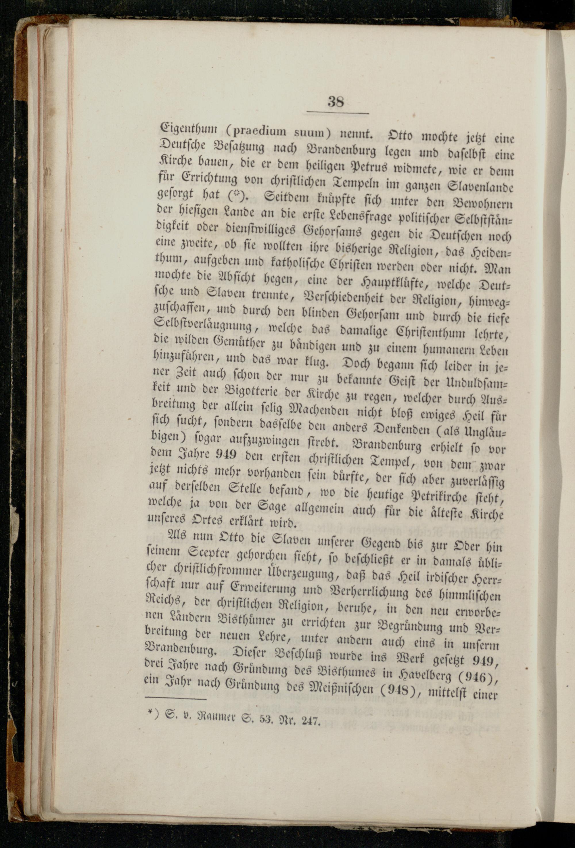 Eigenthum(praedium suum) nennt. Otto mochte jetzt eine Deutſche Beſatzung nach Brandenburg legen und daſelbſt eine Kirche bauen, die er dem heiligen Petrus widmete, wie er denn fuͤr Errichtung von chriſtlichen Tempeln im ganzen Slavenlande geſorgt hat(3). Seitdem knüpfte ſich unter den Bewohnern der hieſigen Lande an die erſte Lebensfrage politiſcher Selbſtſtaͤndigkeit oder dienſtwilliges Gehorſams gegen die Deutſchen noch eine zweite, ob ſie wollten ihre bisherige Religion, das Heiden: thum, aufgeben und katholiſche Chriſten werden oder nicht. Man mochte die Abſicht hegen, eine der Hauptkluͤfte, welche Deut: ſche und Slaven trennte, Verſchiedenheit der Religion, hinwegzuſchaffen, und durch den blinden Gehorſam und durch die tiefe Selbſtverlaͤugnung, welche das damalige Chriſtenthum lehrte, die wilden Gemůther zu baͤndigen und zu einem humanern Leben hinzufüͤhren, und das war klug. Doch begann ſich leider in je: ner Zeit auch ſchon der nur zu bekannte Geiſt der Unduldſam— keit und der Bigotterie der Kirche zu regen, welcher durch Aus: breitung der allein ſelig Machenden nicht bloß ewiges Heil für ſich ſucht, ſondern dasſelbe den anders Denkenden(als Unglaͤubigen) ſogar aufzuzwingen ſtrebt. Brandenburg erhielt ſo vor dem Jahre 949 den erſten chriſtlichen Tempel, von dem zwar jetzt nichts mehr vorhanden ſein durfte, der ſich aber zuverlaͤſſig auf derſelben Stelle befand, wo die heutige Petrikirche ſteht, welche ja von der Sage allgemein auch für die aͤlteſte Kirche unſeres Ortes erklaͤrt wird.