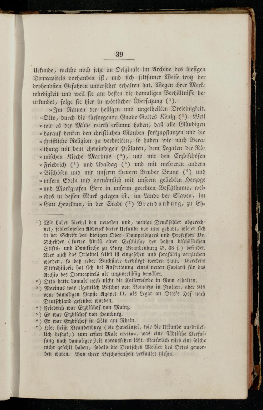 „Im Namen der heiligen und ungetheilten Dreieinigkeit. »Otto, durch die fuͤrſorgende Gnade Gottes König(2). Weil „wir es der Muͤhe werth erkannt haben, daß alle Glaͤubigen „darauf denken den chriſtlichen Glauben fortzupflanzen und die R„chriſtliche Religion zu verbreiten, fo haben wir nach Bera— »thung mit dem ehrwürdigen Praͤlaten, dem Legaten der Roͤ— » mifchen Kirche Marinus(2), und mit den Erzbiſchoͤfen » Friedrich(i) und Adaldag(5) und mit mehreren andern „Biſchoͤfen und mit unſerm theuern Bruder Bruno(5) und »unſern Edeln und vornaͤmlich mit unſerm geliebten Herzoge v und r,. Gero in unſerm geerbten Beſitzthume, wel— „ches in deſſen Mark gelegen iſt, im Lande der Slaven, im »Gau Heveldun, in der Stadt(2) Brendunburg, zu Eh—