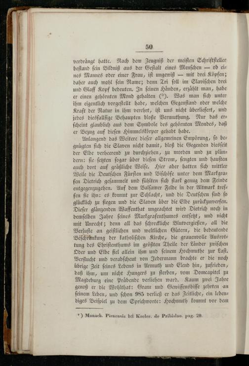 Anlangend das Weitere dieſer allgemeinen Empoͤrung, ſo begnuͤgten ſich die Slaven nicht damit, bloß die Gegenden diesſei der Elbe verheerend zu durchziehen, zu morden und zu pluͤn— dern: ſie ſetzten ſogar uber dieſen Strom, ſengten und hauſten auch dort auf graͤßliche Weiſe. Hier aber hatten ſich mittler Weile die Deutſchen Fuͤrſten und Biſchoͤfe unter dem Markgrafen Dietrich geſammelt und fühlten ſich ſtark genug dem Feinde entgegenzugehen. Auf dem Balſamer Felde in der Altmark treffen ſie ihn: es kommt zur Schlacht, und die Deutſchen ſind ſo glücklich zu ſiegen und die Slaven uͤber die Elbe zuruͤckzuwerfen. Dieſer glaͤnzenden Waffenthat ungeachtet wird Dietrich noch in demſelben Jahre ſeines Markgrafenthumes entſetzt, und nicht mit Unrecht; denn all das ſchreckliche Blutvergießen, all die Verluſte an geiſtlichen und weltlichen Gütern, die bedeutende Beſchraͤnkung der katholiſchen Kirche, die grauenvolle Ausrottung des Chriſtenthums im größten Theile der Länder zwiſchen Oder und Elbe fiel allein ihm und ſeinem Hochmuthe zur Laſt. Verflucht und verabſcheut von Jedermann brachte er die noch übrige Zeit ſeines Lebens in Armuth und Elend hin, zufrieden, daß ihm, um nicht Hungers zu ſterben, vom Domcapitel zu Magdeburg eine Praͤbende verliehen ward. Kaum zwei Jahre genoß er die Wohlthat: Gram und Gewiſſensbiſſe zehrten an feinem Leben, und ſchon 985 verließ er das Zeitliche, ein leben—diges Beiſpiel zu dem Sprichworte: Hochmuth kommt vor dem
