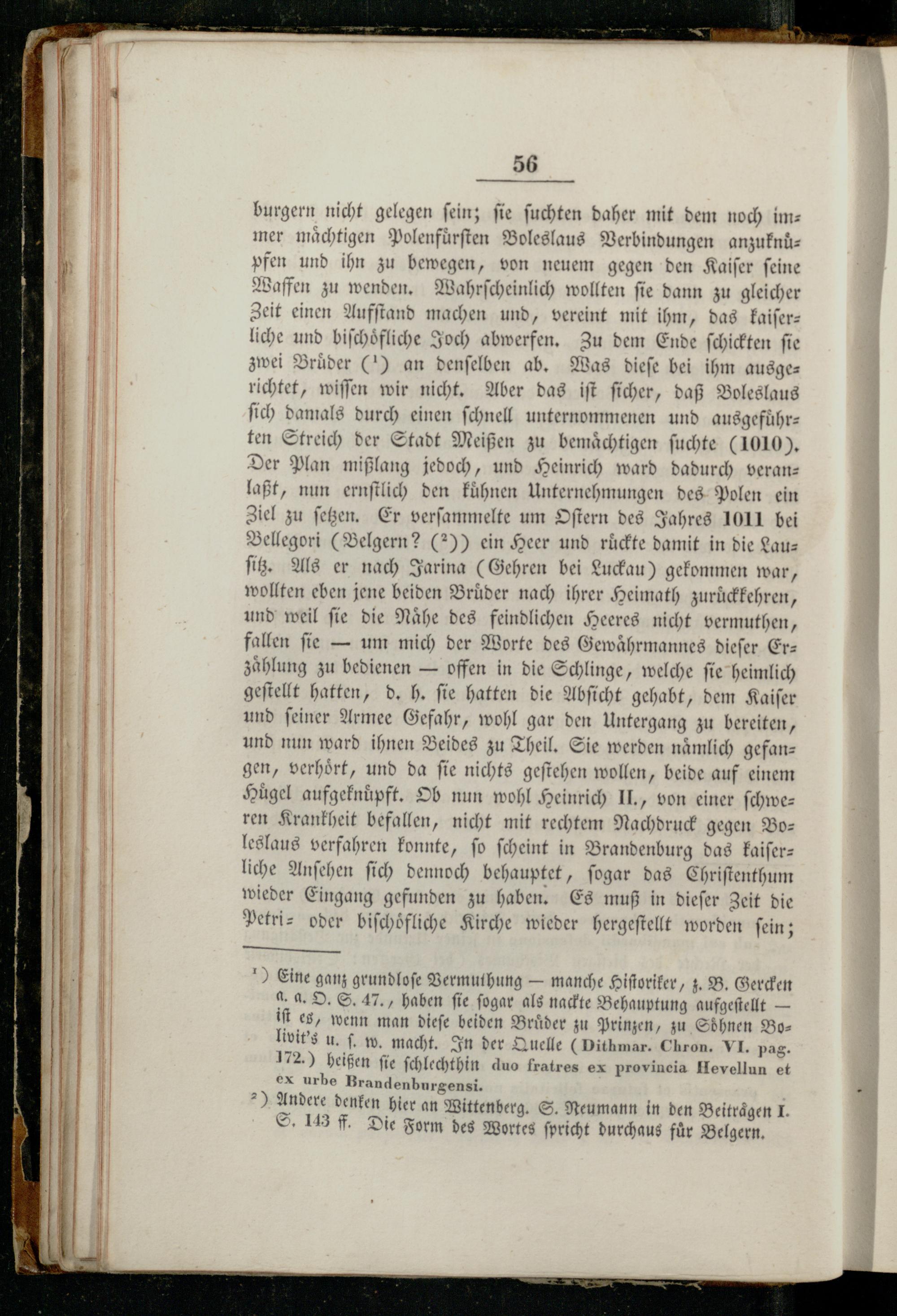 burgern nicht gelegen ſein; fie fuchten daher mit dem noch immer maͤchtigen Polenfuͤrſten Boleslaus Verbindungen anzuknuͤpfen und ihn zu bewegen, von neuem gegen den Kaiſer ſeine Waffen zu wenden. Wahrſcheinlich wollten ſie dann zu gleicher Zeit einen Aufſtand machen und, vereint mit ihm, das kaiſerliche und biſchoͤfliche Joch abwerfen. Zu dem Ende ſchickten ſie zwei Brüder(i) an denſelben ab. Was dieſe bei ihm ausgerichtet, wiſſen wir nicht. Aber das iſt ſicher, daß Boleslaus ſich damals durch einen ſchnell unternommenen und ausgefuͤhrten Streich der Stadt Meißen zu bemaͤchtigen ſuchte(1010). Der Plan mißlang jedoch, und Heinrich ward dadurch veran— laßt, nun ernſtlich den kuͤhnen Unternehmungen des Polen ein Ziel zu ſetzen. Er verſammelte um Oſtern des Jahres 1011 bei Bellegori(Belgern?(2)) ein Heer und rückte damit in die Lau— ſitz. Als er nach Jarina(Gehren bei Luckau) gekommen war, wollten eben jene beiden Bruͤder nach ihrer Heimath zuruͤckkehren, und weil ſie die Naͤhe des feindlichen Heeres nicht vermuthen, fallen fie— um mich der Worte des Gewaͤhrmannes dieſer Erzaͤhlung zu bedienen— offen in die Schlinge, welche ſie heimlich geſtellt hatten, d. h. ſie hatten die Abſicht gehabt, dem Kaiſer und ſeiner Armee Gefahr, wohl gar den Untergang zu bereiten, und nun ward ihnen Beides zu Theil. Sie werden nämlich gefangen, verhoͤrt, und da fie nichts geſtehen wollen, beide auf einem Hügel aufgeknuͤpft. Ob nun wohl Heinrich II., von einer ſchweren Krankheit befallen, nicht mit rechtem Nachdruck gegen Bo— leslaus verfahren konnte, ſo ſcheint in Brandenburg das kaiſer— liche Anſehen ſich dennoch behauptet, ſogar das Chriſtenthum wieder Eingang gefunden zu haben. Es muß in dieſer Zeit die Petri- oder biſchöfliche Kirche wieder hergeſtellt worden ſein; ——————
