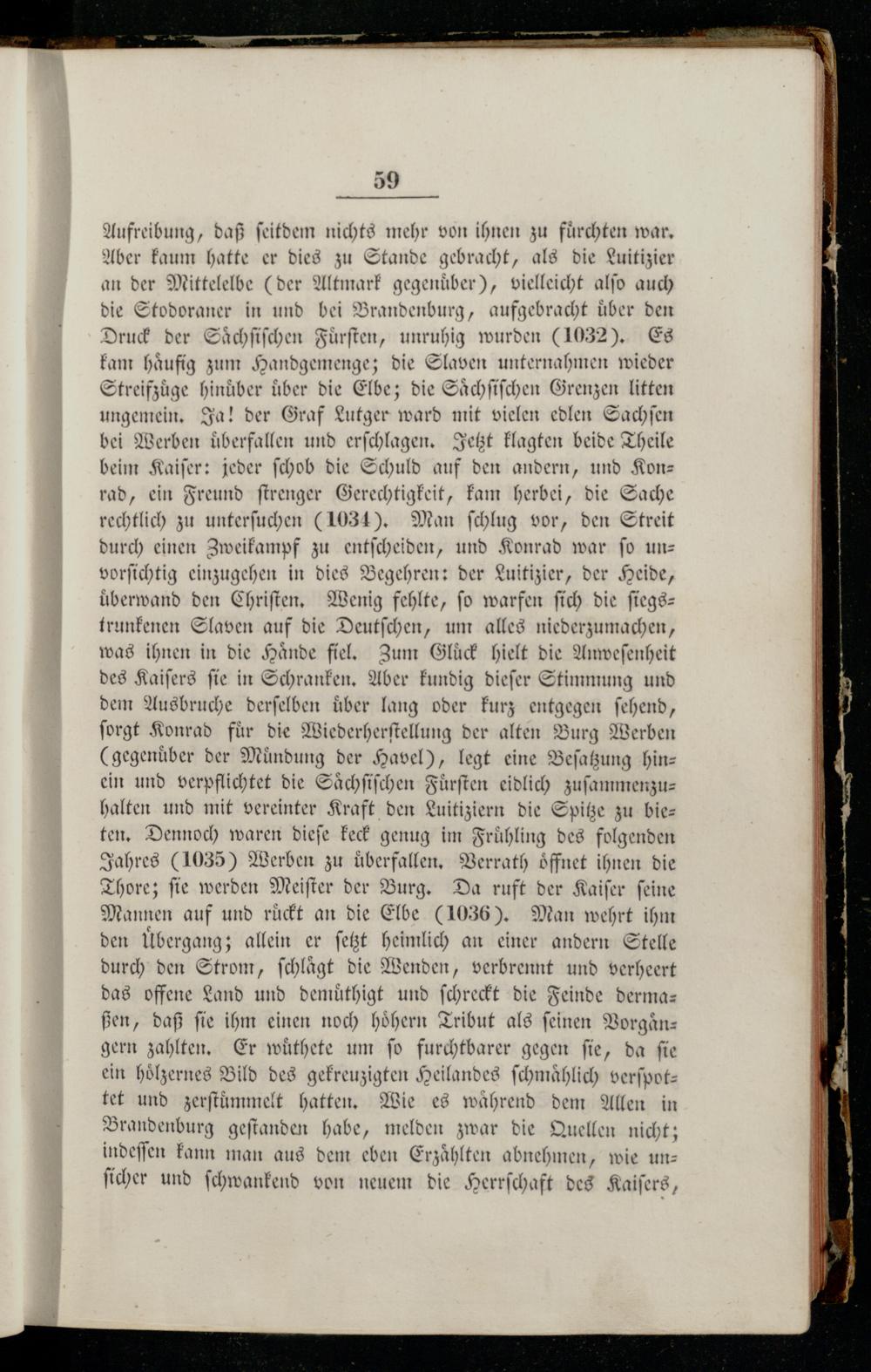 Aufreibung, daß ſeitdem nichts mehr von ihnen zu fürchten war. Aber kaum hatte er dies zu Stande gebracht, als die Luitizier an der Mittelelbe(der Altmark gegenuͤber), vielleicht alſo auch die Stodoraner in und bei Brandenburg, aufgebracht uͤber den Druck der Saͤchſiſchen Fuͤrſten, unruhig wurden(1032). Es kam haͤufig zum Handgemenge; die Slaven unternahmen wieder Streifzüge hinüber über die Elbe; die Saͤchſiſchen Grenzen litten ungemein. Ja! der Graf Lutger ward mit vielen edlen Sachſen bei Werben uͤberfallen und ee Jetzt klagten beide Theile beim Kaiſer: jeder ſchob die Schuld auf den andern, und Konz rad, ein Freund ſtrenger Gerechtigkeit, kam herbei, die Sache rechtlich zu unterſuchen(1034). Man ſchlug vor, den Streit durch einen Zweikampf zu entſcheiden, und Konrad war ſo un— vorſichtig einzugehen in dies Begehren: der Luitizier, der Heide, uͤberwand den Chriſten. Wenig fehlte, ſo warfen ſich die ſiegs— trunkenen Slaven auf die Deutſchen, um alles niederzumachen, was ihnen in die Haͤnde fiel. Zum Gluͤck hi elt die Anweſenheit des Kaiſers ſie in Schranken. Aber kundig dieſer Stimmung und dem Ausbruche derſelben uber lang oder kurz entgegen ſehend, ſorgt Konrad fuͤr die Wiederherſtellung der alten Burg Werben (gegenüber der Mündung der Havel), legt eine Beſatzung hinz ein und verpflichtet die Saͤchſiſchen Fuͤrſten eidlich zuſammenzuhalten und mit vereinter Kraft den Luitiziern die Spitze zu bieten. Dennoch waren dieſe keck genug im Fruͤhling des folgenden Jahres(1035) Werben zu uͤberfallen. Verrath oͤffnet ihnen die Thore; fie werden Meiſter der Burg. Da ruft der Kaiſer feine Mannen auf und ruͤckt an die Elbe(1036). Man wehrt ihm den uͤbergang; allein er ſetzt heimlich an einer andern Stelle durch den Strom, ſchlaͤgt die Wenden, verbrennt und verheert das offene Land und demuͤthigt und ſchreckt die Feinde derma— ßen, daß fie ihm einen noch hoͤhern Tribut als feinen Vorgaͤngern zahlten. Er wuͤthete um ſo furchtbarer gegen ſie, da ſie ein hoͤlzernes Bild des gekreuzigten Heilandes ſchmaͤhlich verſpottet und zerſtuͤmmelt hatten. Wie es während dem Allen in Brandenburg geſtanden habe, melden zwar die Quellen nicht; indeſſen kann man aus dem eben Erzuͤhlten abnehmen, wie un ſicher und ſchwankend von neuem die Herrſchaft des Kaiſers,