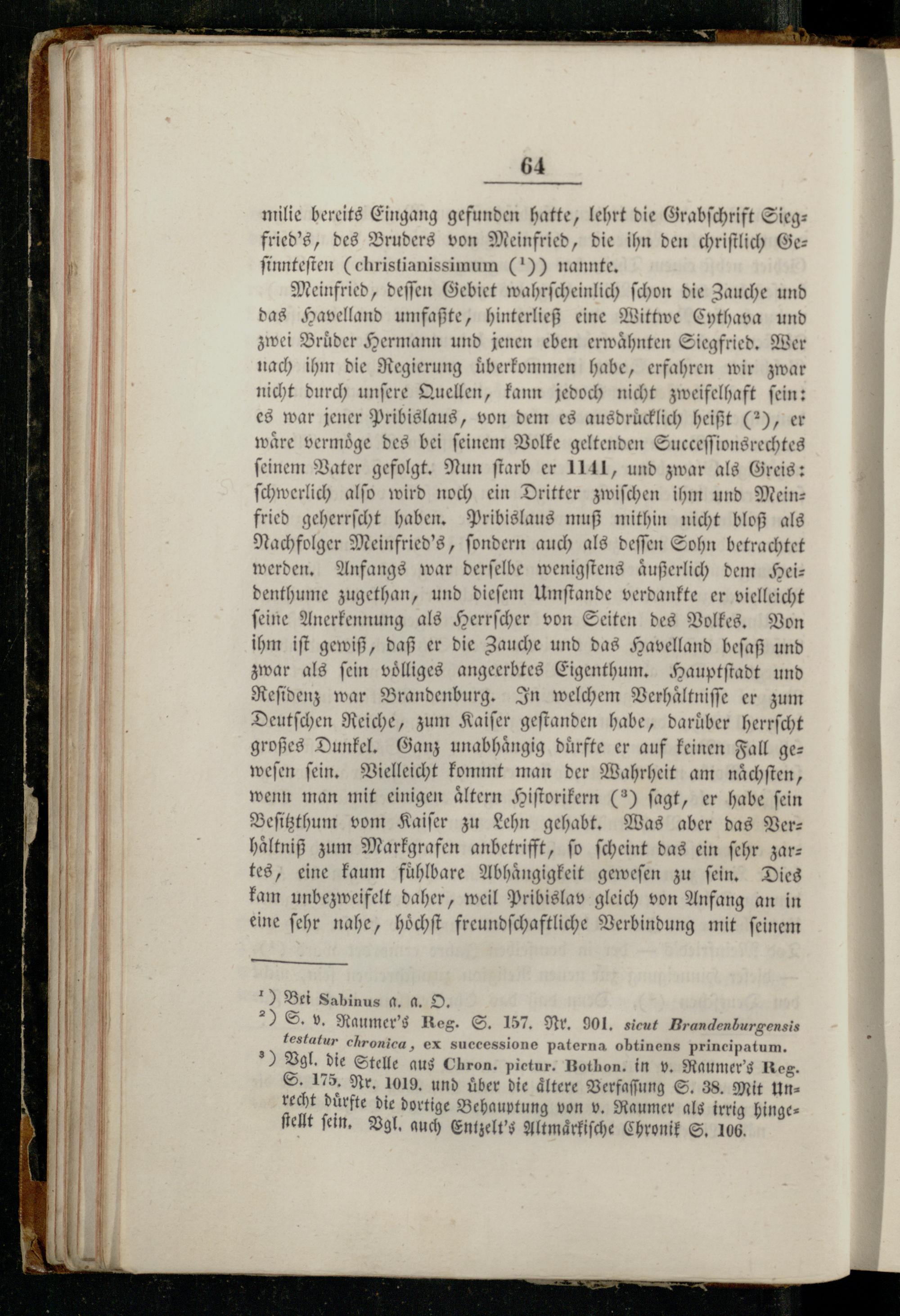 Meinfried, deſſen Gebiet wahrſcheinlich ſchon die Zauche und das Havelland umfaßte, hinterließ eine Wittwe Cythava und zwei Brüder Hermann und jenen eben erwähnten Siegfried. Wer nach ihm die Regierung uͤberkommen habe, erfahren wir zwar nicht durch unſere Quellen, kann jedoch nicht zweifelhaft ſein: es war jener Pribislaus, von dem es ausdrücklich heißt(2), er wäre vermoͤge des bei feinem Volke geltenden Succeſſionsrechtes ſeinem Vater gefolgt. Nun ſtarb er 1141, und zwar als Greis: ſchwerlich alſo wird noch ein Dritter zwiſchen ihm und Mein: fried geherrſcht haben. Pribislaus muß mithin nicht bloß als Nachfolger Meinfried's, ſondern auch als deſſen Sohn betrachtet werden. Anfangs war derſelbe wenigſtens aͤußerlich dem Heiz denthume zugethan, und dieſem Umſtande verdankte er vielleicht ſeine Anerkennung als Herrſcher von Seiten des Volkes. Von ihm iſt gewiß, daß er die Zauche und das Havelland beſaß und zwar als ſein voͤlliges angeerbtes Eigenthum. Hauptſtadt und Reſidenz war Brandenburg. In welchem Verhaͤltniſſe er zum Deutſchen Reiche, zum Kaiſer geſtanden habe, daruͤber herrſcht großes Dunkel. Ganz unabhängig dürfte er auf keinen Fall geweſen ſein. Vielleicht kommt man der Wahrheit am naͤchſten, wenn man mit einigen aͤltern Hiſtorikern(2) ſagt, er habe ſein Beſitzthum vom Kaiſer zu Lehn gehabt. Was aber das Ver: haͤltniß zum Markgrafen anbetrifft, fo ſcheint das ein ſehr zartes, eine kaum fuͤhlbare Abhangigkeit geweſen zu fein, Dies kam unbezweifelt daher, weil Pribislav gleich von Anfang an in eine ſehr nahe, hoͤchſt freundſchaftliche Verbindung mit ſeinem