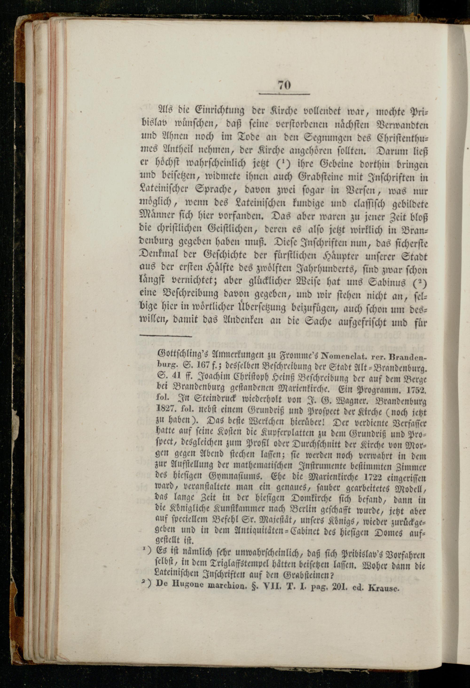 Als die Einrichtung der Kirche vollendet war, mochte Pribislav wuͤnſchen, daß feine verſtorbenen naͤchſten Verwandten und Ahnen noch im Tode an den Segnungen des Chriſtenthu— mes Antheil nehmen, der Kirche angehoͤren ſollten. Darum ließ er hoͤchſt wahrſcheinlich jetzt(i) ihre Gebeine dorthin bringen und beiſetzen, widmete ihnen auch Grabſteine mit Inſchriften in Lateiniſcher Sprache, davon zwei ſogar in Verſen, was nur möglich, wenn des Lateiniſchen kundige und claſſiſch gebildete Maͤnner ſich hier vorfanden. Das aber waren zu jener Zeit bloß die chriſtlichen Geiſtlichen, deren es alſo jetzt wirklich in Bran— denburg gegeben haben muß. Dieſe Inſchriften nun, das ſicherſte Denkmal der Geſchichte der fuͤrſtlichen Haͤupter unſerer Stadt aus der erſten Hälfte des zwölften Jahrhunderts, find zwar ſchon laͤngſt vernichtet; aber gluͤcklicher Weiſe hat uns Sabinus(2) eine Beſchreibung davon gegeben, und wir ſtehen nicht an, ſelbige hier in woͤrtlicher ͤberſetzung beizufügen, auch ſchon um des: willen, damit das Andenken an die Sache aufgefriſcht und für