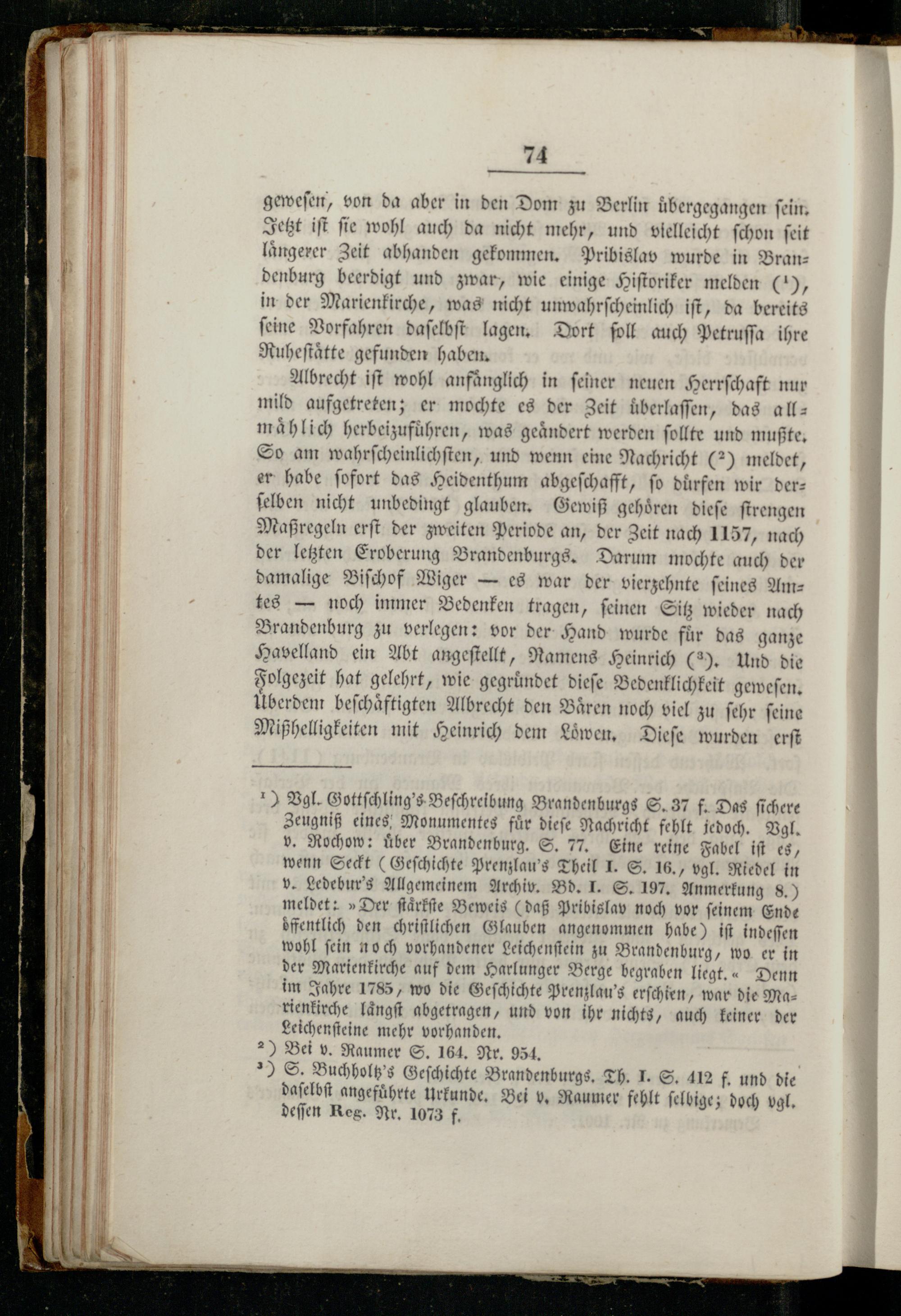 ) Vgl. Gottſchling's Beſchreibung Brandenburgs S. 37 f. Das ſichere Zeugniß eines Monumentes fuͤr dieſe Nachricht fehlt jedoch. Vgl. v. Rochow: uͤber Brandenburg. S. 77. Eine reine Fabel iſt es, wenn Seckt(Geſchichte Prenzlau's Theil 1. S. 16., vgl. Riedel in v. Ledebur's Allgemeinem Archiv. Bd. J. S. 197. Anmerkung 8.) meldet:»Der ſtaͤrkſte Beweis(daß Pribislav noch vor ſeinem Ende oͤffentlich den chriſtlichen Glauben angenommen habe) iſt indeſſen wohl ſein noch vorhandener Leichenſtein zu Brandenburg, wo er in der Marienkirche auf dem Harlunger Berge begraben liegt. Denn im Jahre 1755, wo die Geſchichte Prenzlau's erſchien, war die Ma— rienkirche laͤngſt abgetragen, und von ihr nichts, auch keiner der Leichenſteine mehr vorhanden.