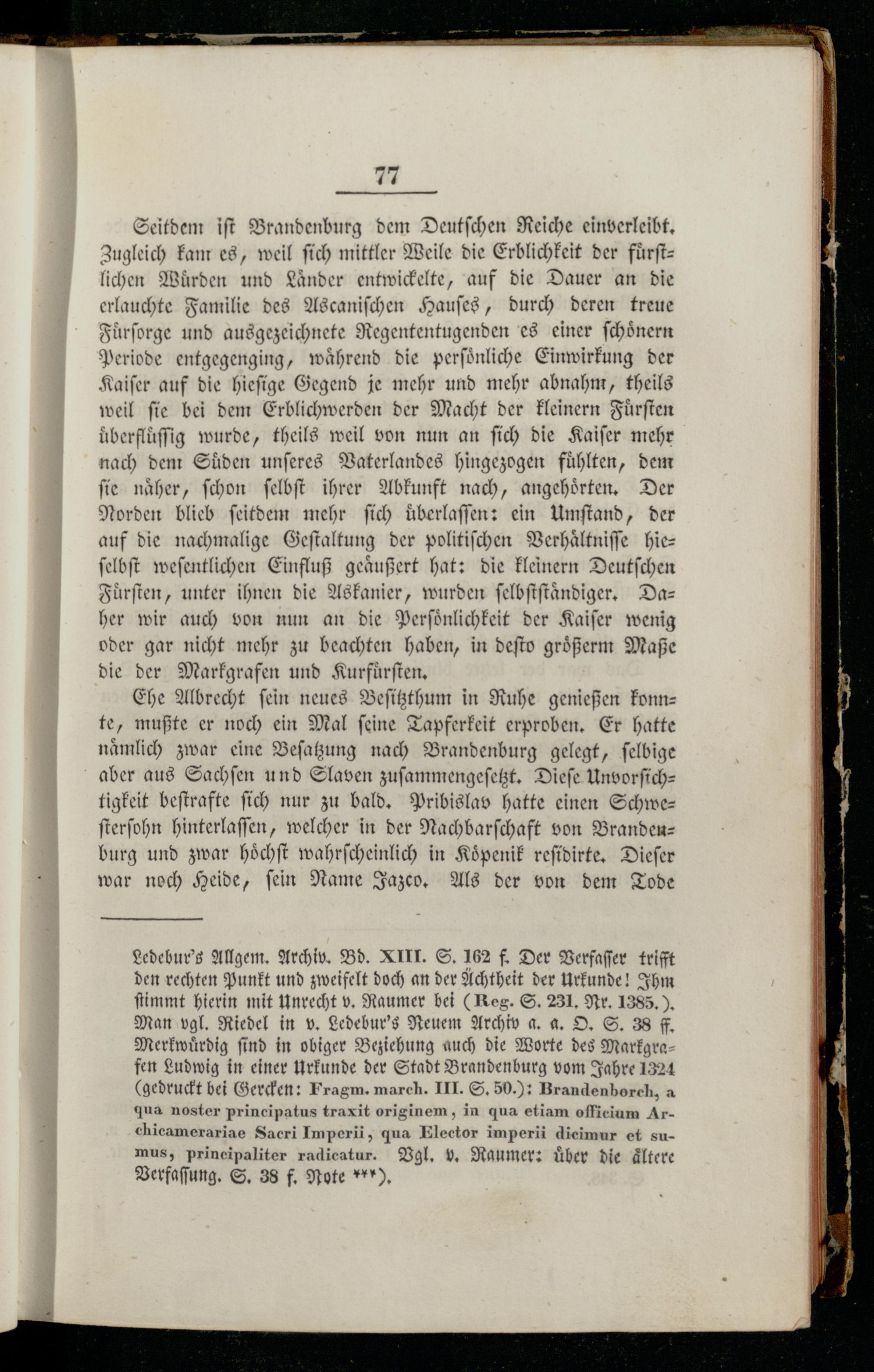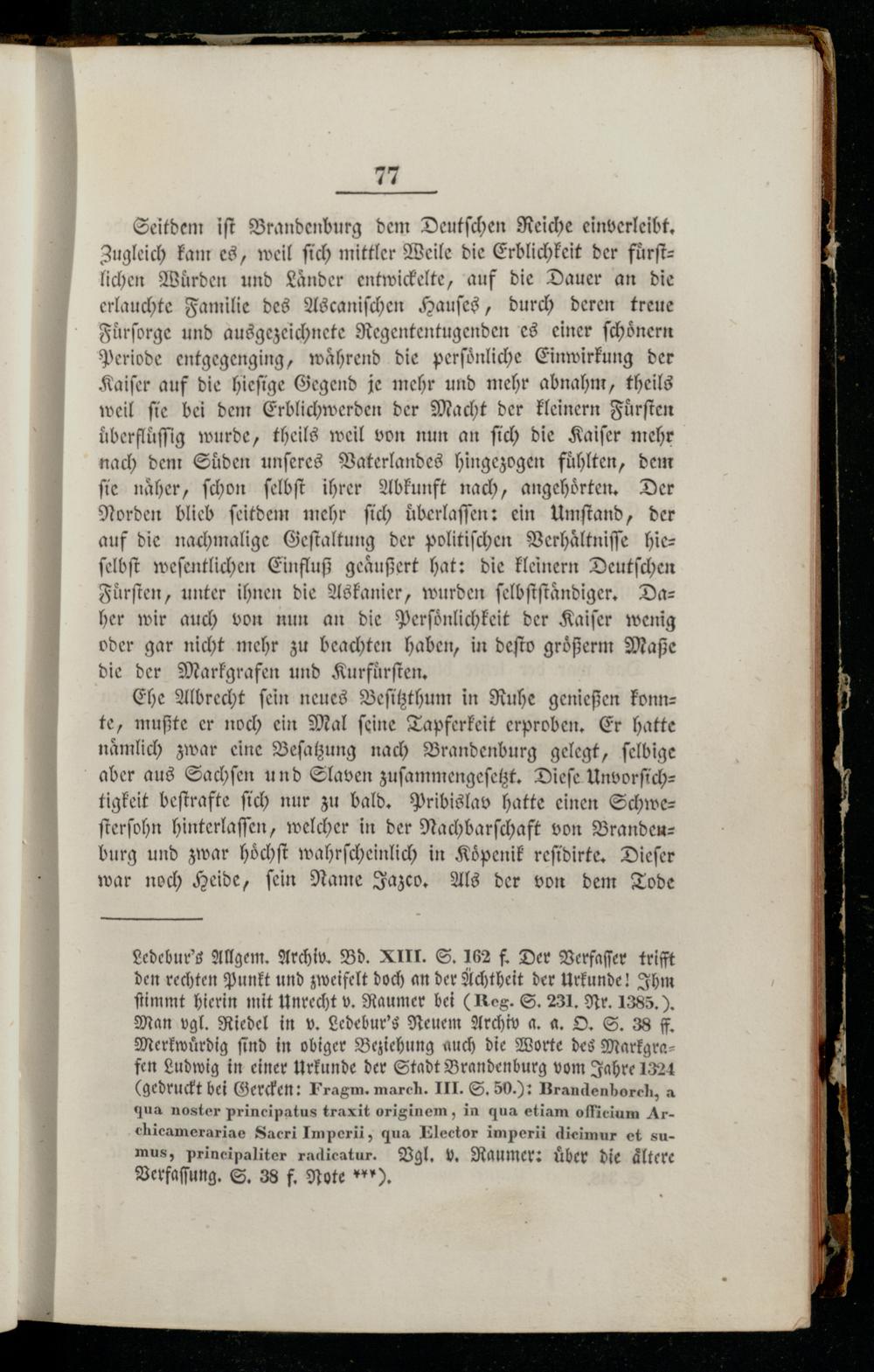 Seitdem iſt Brandenburg dem Deutſchen Reiche einverleibt. Zugleich kam es, weil ſich mittler Weile die Erblichkeit der fuͤrſtlichen Würden und Länder entwickelte, auf die Dauer an die erlauchte Familie des Ascaniſchen Hauſes, durch deren treue Fuͤrſorge und ausgezeichnete Regententugenden es einer ſchoͤnern Periode entgegenging, während die perſoͤnliche Einwirkung der Kaiſer auf die hieſige Gegend je mehr und mehr abnahm, theils weil fie bei dem Erblichwerden der Macht der kleinern Fuͤrſten überfluͤſſig wurde, theils weil von nun an ſich die Kaiſer mehr nach dem Suͤden unſeres Vaterlandes hingezogen fuͤhlten, dem ſie naͤher, ſchon ſelbſt ihrer Abkunft nach, angehoͤrten. Der Norden blieb ſeitdem mehr ſich uͤberlaſſen: ein Umſtand, der auf die nachmalige Geſtaltung der politiſchen Verhaͤltniſſe hie— ſelbſt weſentlichen Einfluß geaͤußert hat: die kleinern Deutſchen Fuͤrſten, unter ihnen die Askanier, wurden ſelbſtſtaͤndiger. Da— her wir auch von nun an die Perſoͤnlichkeit der Kaiſer wenig oder gar nicht mehr zu beachten haben, in deſto groͤßerm Maße die der Markgrafen und Kurfuͤrſten.