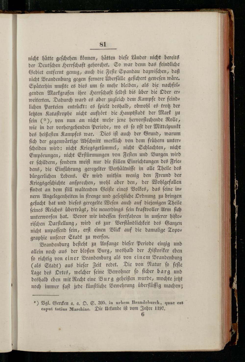 nicht hätte geſchehen koͤnnen, hätten dieſe Laͤnder nicht bereits der Deutſchen Herrſchaft gehorchet. So war denn das feindliche Gebiet entfernt genug, auch die Feſte Spandau dazwiſchen, daß nicht Brandenburg gegen fernere Überfälle geſichert geweſen waͤre. Spaͤterhin mußte es dies um fo mehr bleiben, als die nachfolgenden Markgrafen ihre Herrſchaft ſelbſt bis über die Oder er= weiterten. Dadurch ward es aber zugleich dem Kampfe der feindlichen Parteien entruͤckt: es ſpielt deshalb, obwohl es trotz der letzten Kataſtrophe nicht aufhört die Hauptſtadt der Mark zu ſein(2), von nun an nicht mehr jene hervorſtechende Rolle, wie in der vorhergehenden Periode, wo es ſo oft der Mittelpunkt des heißeſten Kampfes war. Dies iſt auch der Grund, warum ſich der gegenwärtige Abſchnitt merklich von dem frühern unters ſcheiden wird: nicht Kriegsgetuͤmmel, nicht Schlachten, nicht Empoͤrungen, nicht Erſtuͤrmungen von Feſten und Burgen wird er ſchildern, ſondern meiſt nur die ſtillen Einrichtungen des Frie— dens, die Einführung geregelter Verhaͤltniſſe in alle Theile des bürgerlichen Lebens. Er wird mithin wenig den Freund der Kriegsgeſchichte anſprechen, wohl aber den, der Wohlgefallen findet an dem ſtill waltenden Geiſte eines Volkes, das ſeine innern Angelegenheiten in ſtrenge und geſetzliche Ordnung zu bringen geſucht hat und dieſes geregelte Weſen auch auf diejenigen Theile ſeines Reiches uͤbertraͤgt, die neuerdings fein kraftvoller Arm ſich unterworfen hat. Bevor wir indeſſen fortfahren in unſerer hiſtoriſchen Darſtellung, wird es zur Verſtaͤndlichkeit des Ganzen nicht unpaſſend ſein, erſt einen Blick auf die damalige Topographie unſerer Stadt zu werfen.