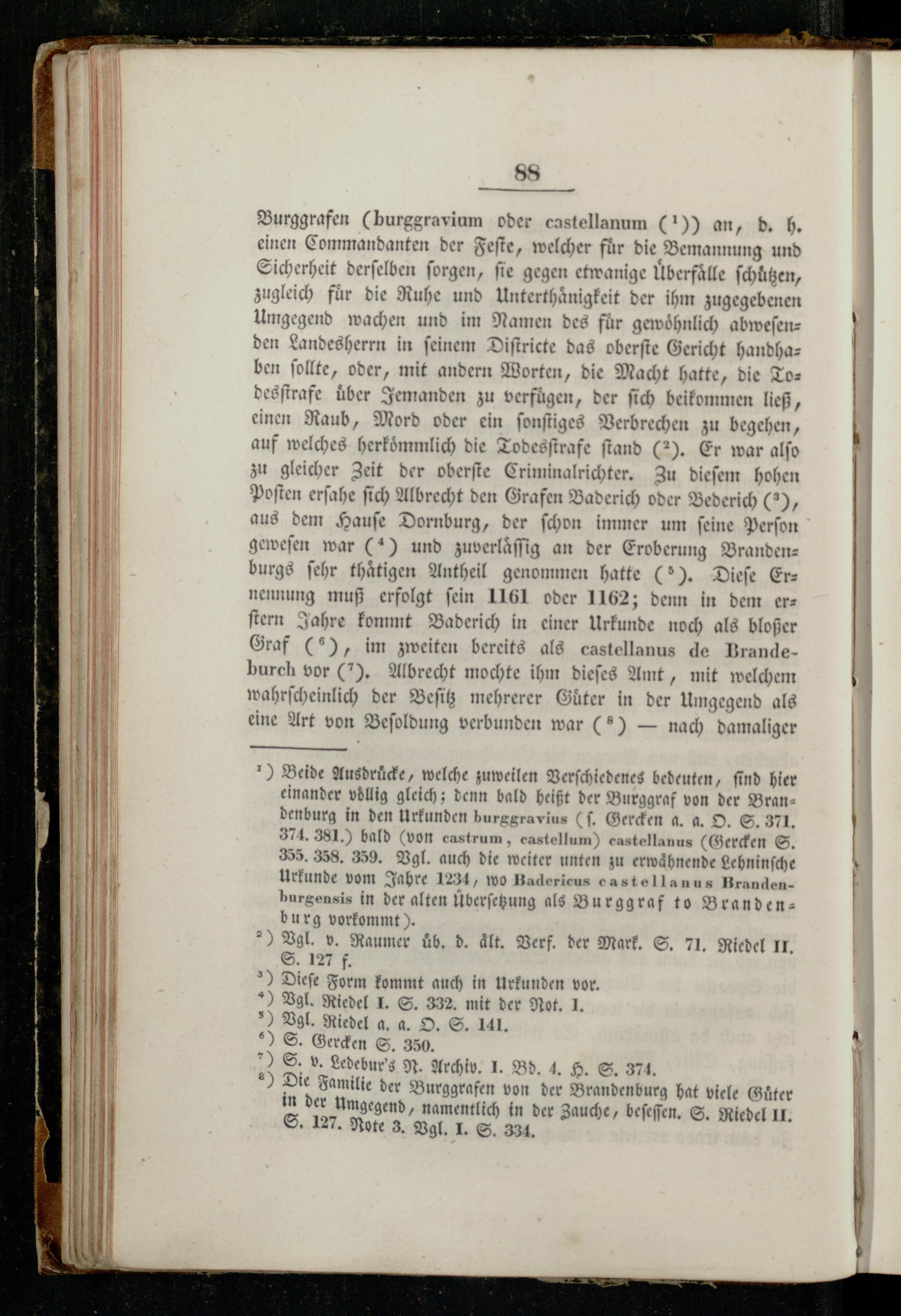 Burggrafen(burggravium oder castellanum(N). on, w h. einen Commandanten der Feſte, welcher für d die Bemannung und Sicherheit derſelben ſorgen, ſie gegen etwanige Überfälle ſchůtzen, zugleich fuͤr die Ruhe und Unterthaͤnigkeit der ihm zugegebenen Umgegend wachen und im Namen des für gewöhnlich abweſenden Landesherrn in feinem Diſtricte das berſte Gericht handha— ben ſollte, oder, mit andern Worten, die“Macht hatte, die Todesſtrafe über Jemanden zu verfügen, der ſich beikommen ließ, einen Raub, Mord oder ein ſonſtiges Ver reihe zu begehen, auf welches herfömmlich die Todesfirafe ſtan d(2). Er war alſo zu gleicher Zeit der. Er mia iht Zu dieſem hohen Poſten erſahe ſich Albrecht n Grafen Baderich oder Bederich CC), aus dem Haufe— der ſchon immer um ſeine Perſon geweſen war(*) und zuverlaͤſſig an der Eroberung Brandenburgs ſehr thaͤtigen Antheil genommen hatte C5). Dieſe Erz nennung muß erfolgt ſein 1161 oder 1162; denn in dem er— ſtern Jahre kommt Baderich in einer Urkunde noch als bloßer Graf(5), im zweiten bereits als castellanus de Brandeburch vor(). Albrecht mochte ihm dieſes Amt, mit welchem wahrſcheinlich der Beſitz mehrerer Guͤter in der Umgegend als eine Art von Beſoldung verbunden war(6)— nach damaliger rr
