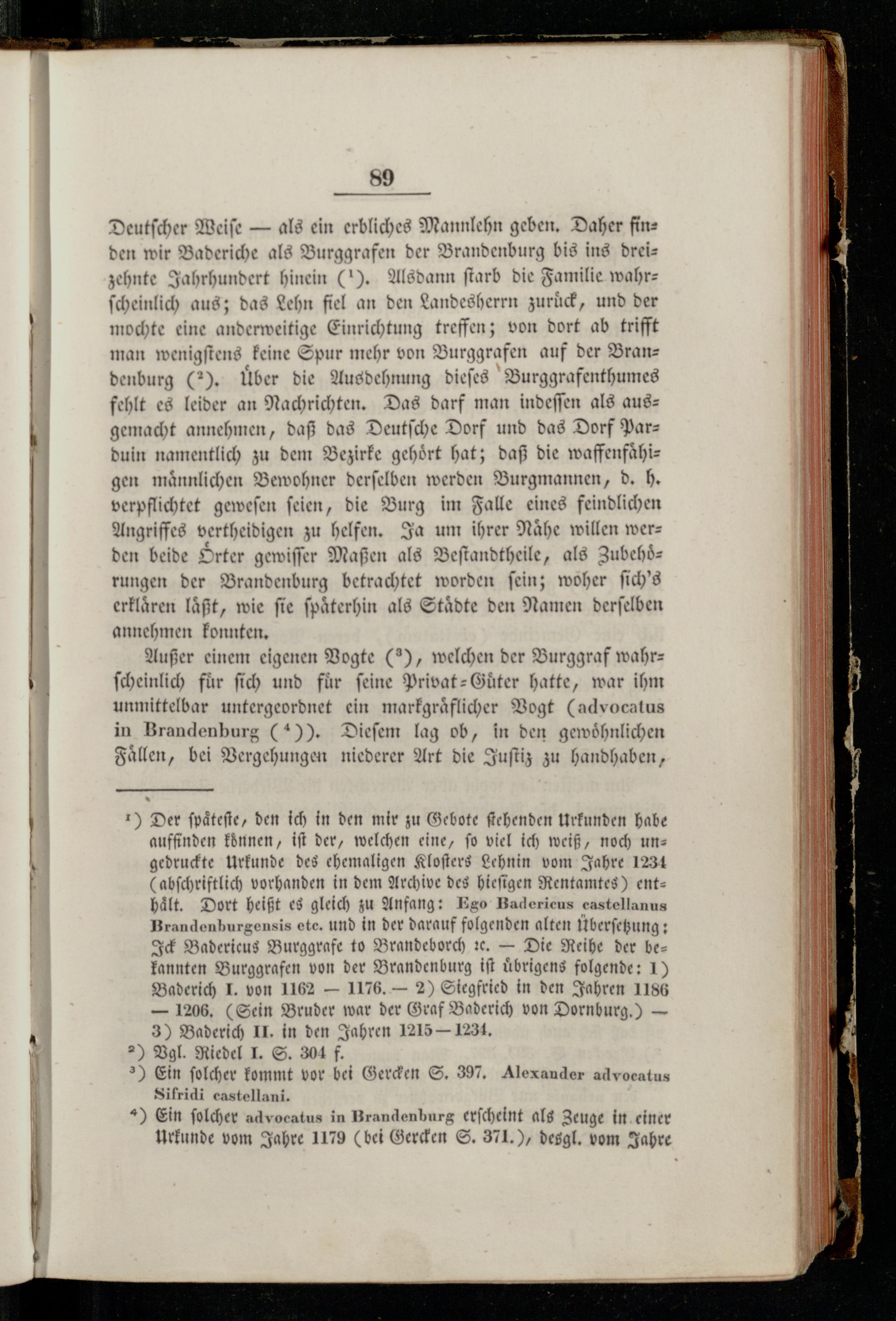 ) Der ſpaͤteſte, den ich in den mir zu Gebote ſtehenden Urkunden habe auffinden koͤnnen, iſt der, welchen eine, ſo viel ich weiß, noch ungedruckte Urkunde des ehemaligen Kloſters Lehnin vom Jahre 1234 (abſchriftlich vorhanden in dem Archive des hieſigen Rentamtes) enthält, Dort heißt es gleich zu Anfang: Ego Badericus ecastellanus Brandenburgensis etc. und in der darauf folgenden alten Überſetzung: Ick Baderieus Burggrafe to Brandeborch 3c.— Die Reihe der bekannten Burggrafen von der Brandenburg iſt uͤbrigens folgende: 1) Baderich I. von 1162— 1176.— 2) Siegfried in den Jahren 1186 — 1206.(Sein Bruder war der Graf Baderich von Dornburg.)— 3) Baderich II. in den Jahren 1215— 1234.