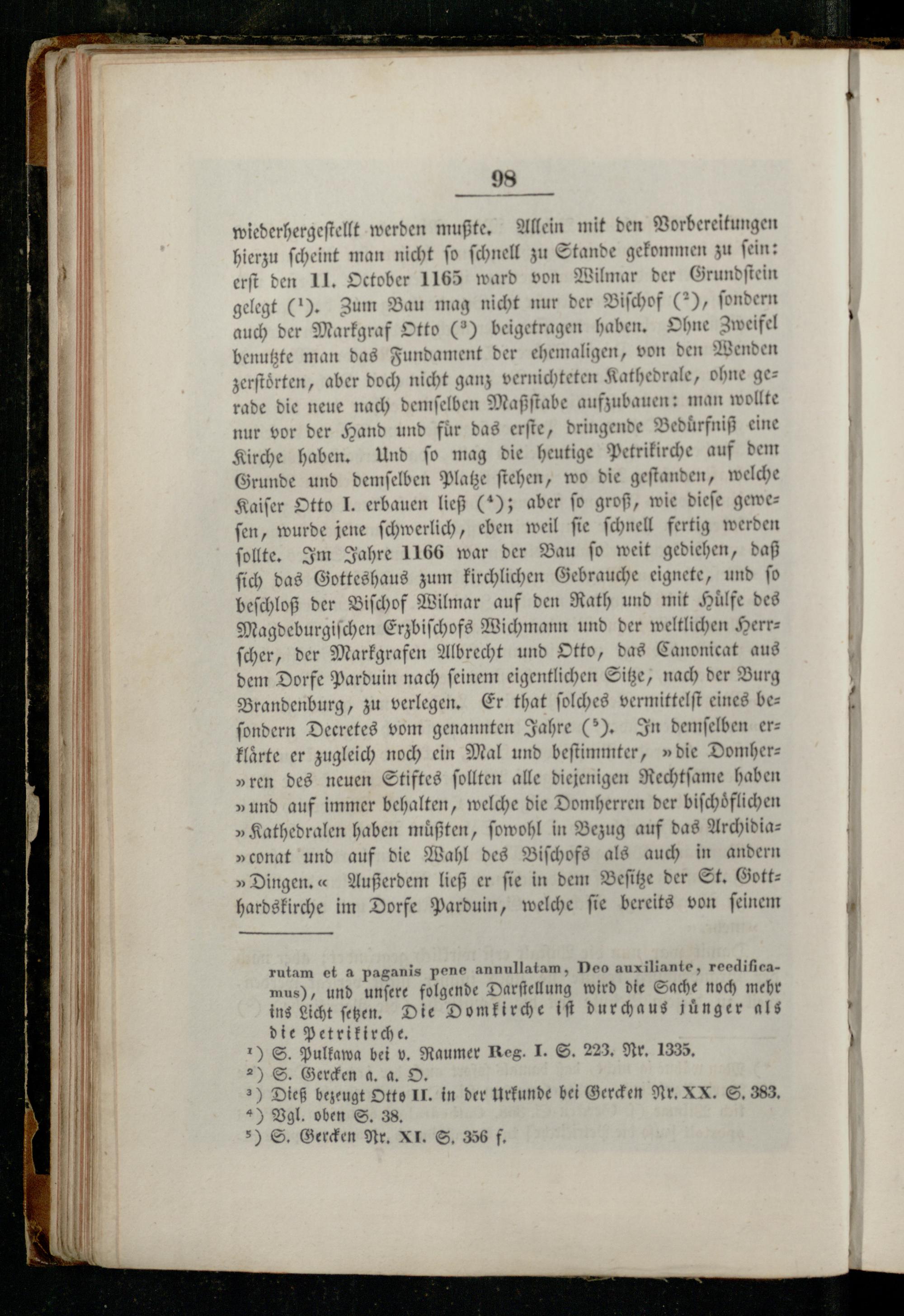 98 wiederhergeſtellt werden mußte. Allein mit den Vorbereitungen hierzu ſcheint man nicht ſo ſchnell zu Stande gekommen zu ſein: erſt den 11. October 1165 ward von Wilmar der Grundſtein gelegt(I). Zum Bau mag nicht nur der Biſchof(2), ſondern auch der Markgraf Otto(2) beigetragen haben. Ohne Zweifel benutzte man das Fundament der ehemaligen, von den Wenden zerſtoͤrten, aber doch nicht ganz vernichteten Kathedrale, ohne gerade die neue nach demſelben Maßſtabe aufzubauen: man wollte nur vor der Hand und für das erſte, dringende Beduͤrfniß eine Kirche haben. Und ſo mag die heutige Petrikirche auf dem Grunde und demſelben Platze ſtehen, wo die geſtanden, welche Kaiſer Otto J. erbauen ließ(; aber fo groß, wie dieſe geweſen, wurde jene ſchwerlich, eben weil ſie ſchnell fertig werden ſollte. Im Jahre 1166 war der Bau ſo weit gediehen, daß ſich das Gotteshaus zum kirchlichen Gebrauche eignete, und ſo beſchloß der Biſchof Wilmar auf d ı Rath und mit Hülfe des Magde e den Erzbiſchofs Wichmann und der weltlichen Herrſcher, der Markgrafen Albrecht und Otto, das Canonicat aus dem Dorfe Parduin nach ſeinem eigentlichen Sitze, nach der Burg Brandenburg, zu verlegen. Er that ſolches vermittelſt eines beſondern Decretes vom genannten Jahre(5). In demſelben erklaͤrte er zugleich noch ein Maũl und beſtimmter,»die Domher„ren des neuen Stiftes ſollten alle diejenigen Rechtſame haben »und auf immer behalten, welche die Domherren der biſchoͤflichen „Kathedralen haben müßten, ſowohl in Bezug auf das Archidia»conat und auf die Wahl des Biſchofs als auch in andern » Dingen,« Außerdem ließ er fie in dem Beſitze der St. Gotthardskirche im Dorfe Parduin, welche ſie bereits von ſeinem