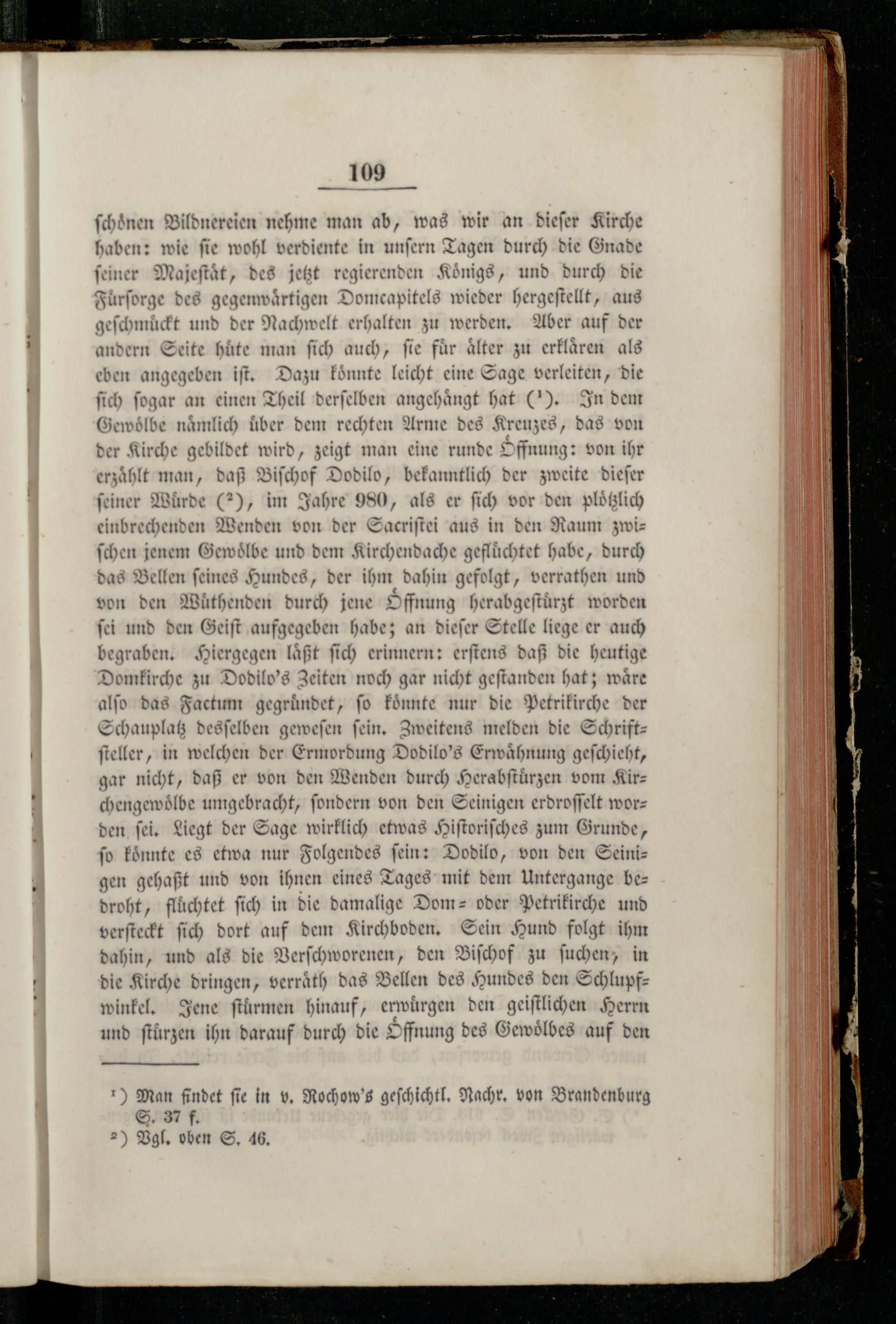 109 ſchoͤnen Bildnereien nehme man ab, was wir an dieſer Kirche haben: wie ſie wohl verdiente in unſern Tagen durch die Gnade feiner Majeſtaͤt, des jetzt regierenden Königs, und durch die Fuͤrſorge des gegenwärtigen Domcapitels wieder hergeſtellt, aus geſchmuͤckt und der Nachwelt erhalten zu werden. Aber auf der andern Seite hüte man ſich auch, fie für älter zu erklaͤren als eben angegeben iſt. Dazu koͤnnte leicht eine Sage verleiten, die ſich ſogar an einen Theil derſelben angehängt hat(*). In dem Gewoͤlbe nämlich uͤber dem rechten Arme des Kreuzes, das von er Kirche gebildet wird, zeigt man eine runde Öffnung: von ihr erzaͤhlt man, daß Biſchof Dodilo, bekanntlich der zweite dieſer feiner Würde(2), im Jahre 980, als er ſich vor den ploͤtzlich einbrechenden Wenden von der Sacriſtei aus in den Raum zwi— ſchen jenem Gewoͤlbe und dem Kirchendache gefluͤchtet habe, durch das Bellen ſeines Hundes, der ihm dahin gefolgt, verrathen und von den Wuthenden durch jene Offnung herabgeſtuͤrzt worden ſei und den Geiſt aufgegeben habe; an dieſer Stelle liege er auch begraben. Hiergegen laͤßt ſich erinnern: erſtens daß die heutige Domkirche zu Dodilo's Zeiten noch gar nicht geſtanden hat; waͤre alſo das Factum gegruͤndet, ſo koͤnnte nur die Petrikirche der Schauplatz desſelben geweſen ſein. Zweitens melden die Schrift— ſteller, in welchen der Ermordung Dodilo's Erwaͤhnung geſchieht, gar nicht, daß er von den Wenden durch Herabſtuͤrzen vom Kirchengewoͤlbe umgebracht, ſondern von den Seinigen erdroſſelt wor— den ſei. Liegt der Sage wirklich etwas Hiſtoriſches zum Grunde, fo koͤnnte es etwa nur Folgendes ſein: Dodilo, von den Seini— gen gehaßt und von ihnen eines Tages mit dem Untergange bedroht, fluͤchtet ſich in die damalige Dom- oder Petrikirche und verſteckt ſich dort auf dem Kirchboden. Sein Hund folgt ihm dahin, und als die Verſchworenen, den Biſchof zu ſuchen, in die Kirche dringen, verraͤth das Bellen des Hundes den Schlupf: winkel. Jene ſtäͤrmen hinauf, erwurgen den geiſtlichen Herrn und ſtürzen ihn darauf durch die Offnung d des Gewoͤlbes auf den