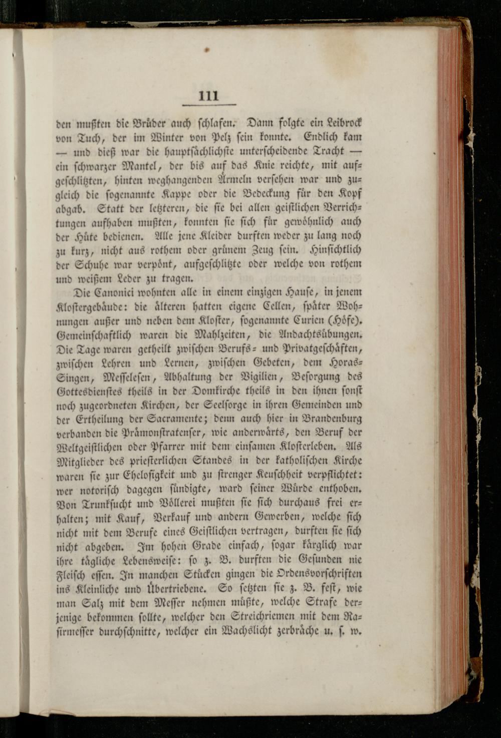Die Canonici wohnten alle in einem einzigen Hauſe, in jenem Kloſtergebaͤude: die aͤlteren hatten eigene Cellen, ſpaͤter Wohnungen außer und neben dem Kloſter, ſogenannte Curien(Hoͤfe). Gemeinſchaftlich waren die Mahlzeiten, die Andachtsübungen. Die Tage waren getheilt zwiſchen Berufs- und Privatgeſchaͤften, zwiſchen Lehren und Lernen, zwiſchen Gebeten, dem HorasSingen, Meſſeleſen, Abhaltung der Vigilien, Beſorgung des Gottesdienſtes theils in der Domkirche theils in den ihnen ſonſt noch zugeordneten Kirchen, der Seelſorge in ihren Gemeinden und der Ertheilung der Sacramente; denn auch hier in Brandenburg verbanden die Praͤmonſtratenſer, wie anderwaͤrts, den Beruf der Weltgeiſtlichen oder Pfarrer mit dem einſamen Kloſterleben. Als Mitglieder des prieſterlichen Standes in der katholiſchen Kirche waren ſie zur Eheloſigkeit und zu ſtrenger Keuſchheit verpflichtet: wer notoriſch dagegen ſuͤndigte, ward feiner Würde enthoben. Von Trunkſucht und Voͤllerei mußten fie ſich durchaus frei erz halten; mit Kauf, Verkauf und andern Gewerben, welche ſich nicht mit dem Berufe eines Geiſtlichen vertragen, durften ſie ſich nicht abgeben. Im hohen Grade einfach, ſogar kaͤrglich war ihre tägliche Lebensweiſe: fo z. B. durften die Geſunden nie Fleiſch eſſen. In manchen Stücken gingen die Ordens vorſchriften ins Kleinliche und ͤbertriebene. So ſetzten fie z. B. feſt, wie man Salz mit dem Meſſer nehmen mußte, welche Strafe derjenige bekommen ſollte, welcher den Streichriemen mit dem Raſirmeſſer durchſchnitte, welcher ein Wachslicht zerbraͤche u. ſ. w.