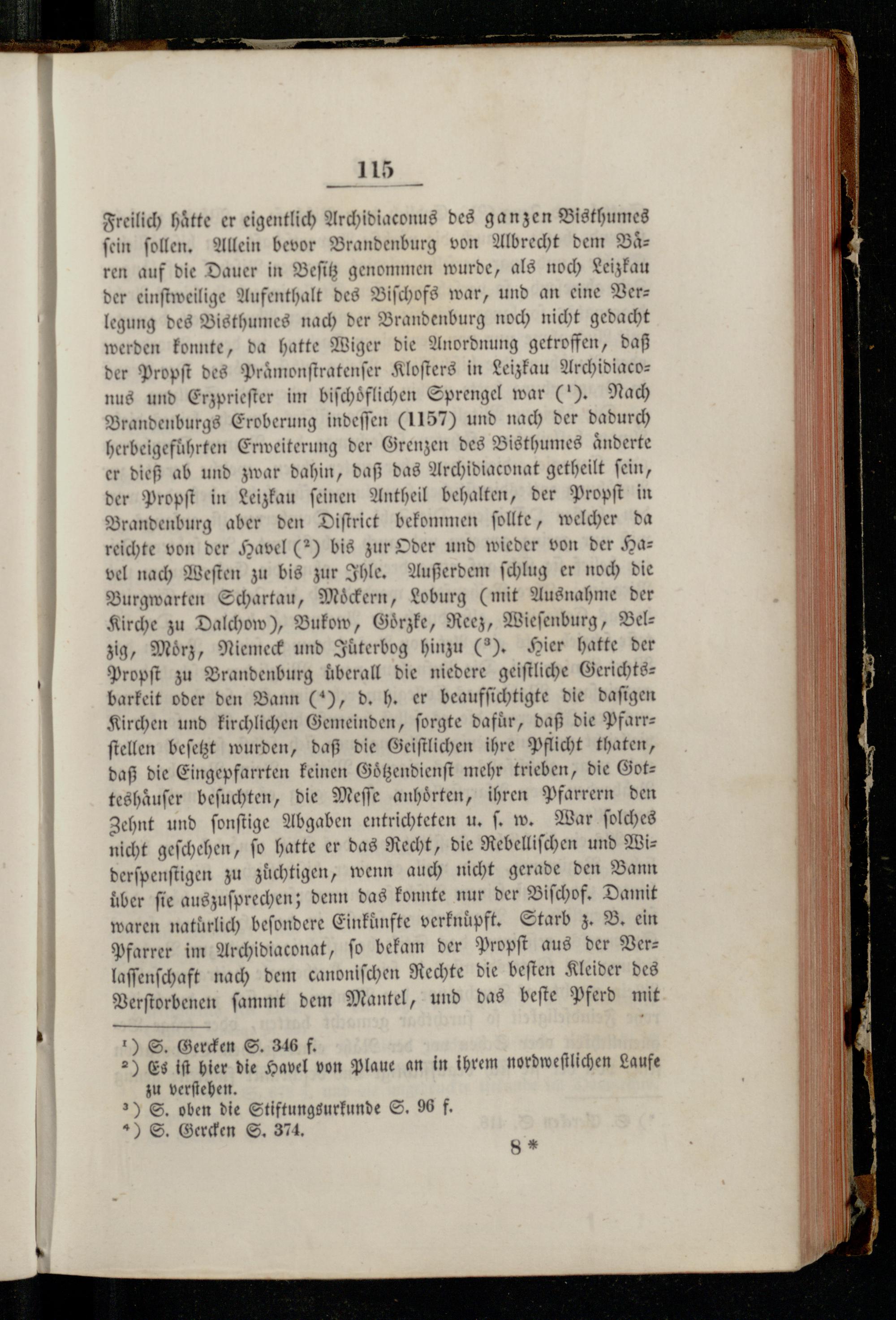 Freilich Hätte er eigentlich Archidiaconus des ganzen Bisthumes ſein ſollen. Allein bevor Brandenburg von Albrecht dem Baͤ— ren auf die Dauer in Beſitz genommen wurde, als noch Leizkau der einſtweilige Aufenthalt des Biſchofs war, und an eine Verlegung des Bisthumes nach der Brandenburg noch nicht gedacht werden konnte, da hatte Wiger die Anordnung getroffen, daß der Propſt des Praͤmonſtratenſer Kloſters in Leizkau Archidiaconus und Erzprieſter im biſchoͤflichen Sprengel war(). Nach Brandenburgs Eroberung indeſſen(1157) und nach der dadurch herbeigeführten Erweiterung der Grenzen des Bisthumes aͤnderte er dieß ab und zwar dahin, daß das Archidiaconat getheilt ſein, der Propſt in Leizkau feinen Antheil behalten, der Propſt in Brandenburg aber den Diſtrict bekommen ſollte, welcher da reichte von der Havel(2) bis zur Oder und wieder von der Havel nach Weſten zu bis zur Ihle. Außerdem ſchlug er noch die Burgwarten Schartau, Moͤckern, Loburg(mit Ausnahme der Kirche zu Dalchow), Bukow, Goͤrzke, Reez, Wieſenburg, Bel— zig, Moͤrz, Niemeck und Juͤterbog hinzu(?). Hier hatte der Propſt zu Brandenburg überall die niedere geiſtliche Gerichts—barkeit oder den Bann(), d. h. er beaufſichtigte die daſigen Kirchen und kirchlichen Gemeinden, ſorgte dafuͤr, daß die Pfarr— ſtellen beſetzt wurden, daß die Geiſtlichen ihre Pflicht thaten, daß die Eingepfarrten keinen Goͤtzendienſt mehr trieben, die Gotteshaͤuſer beſuchten, die Meſſe anhoͤrten, ihren Pfarrern den Zehnt und ſonſtige Abgaben entrichteten u. ſ. w. War ſolches nicht geſchehen, ſo hatte er das Recht, die Rebelliſchen und Widerſpenſtigen zu zuͤchtigen, wenn auch nicht gerade den Bann über ſie auszuſprechen; denn das konnte nur der Biſchof. Damit waren naturlich beſondere Einkünfte verknüpft. Starb z. B. ein Pfarrer im Archidiaconat, ſo bekam der Propſt aus der Verlaſſenſchaft nach dem canoniſchen Rechte die beſten Kleider des Verſtorbenen ſammt dem Mantel, und das beſte Pferd mit 1) S. Gercken S. 346 f. 2) Es iſt hier die Havel von Plaue an in ihrem nordweſtlichen Laufe zu verſtehen. 23) S. oben die Stiftungsurkunde S. 96 f. N) S. Gercken S. 374.
