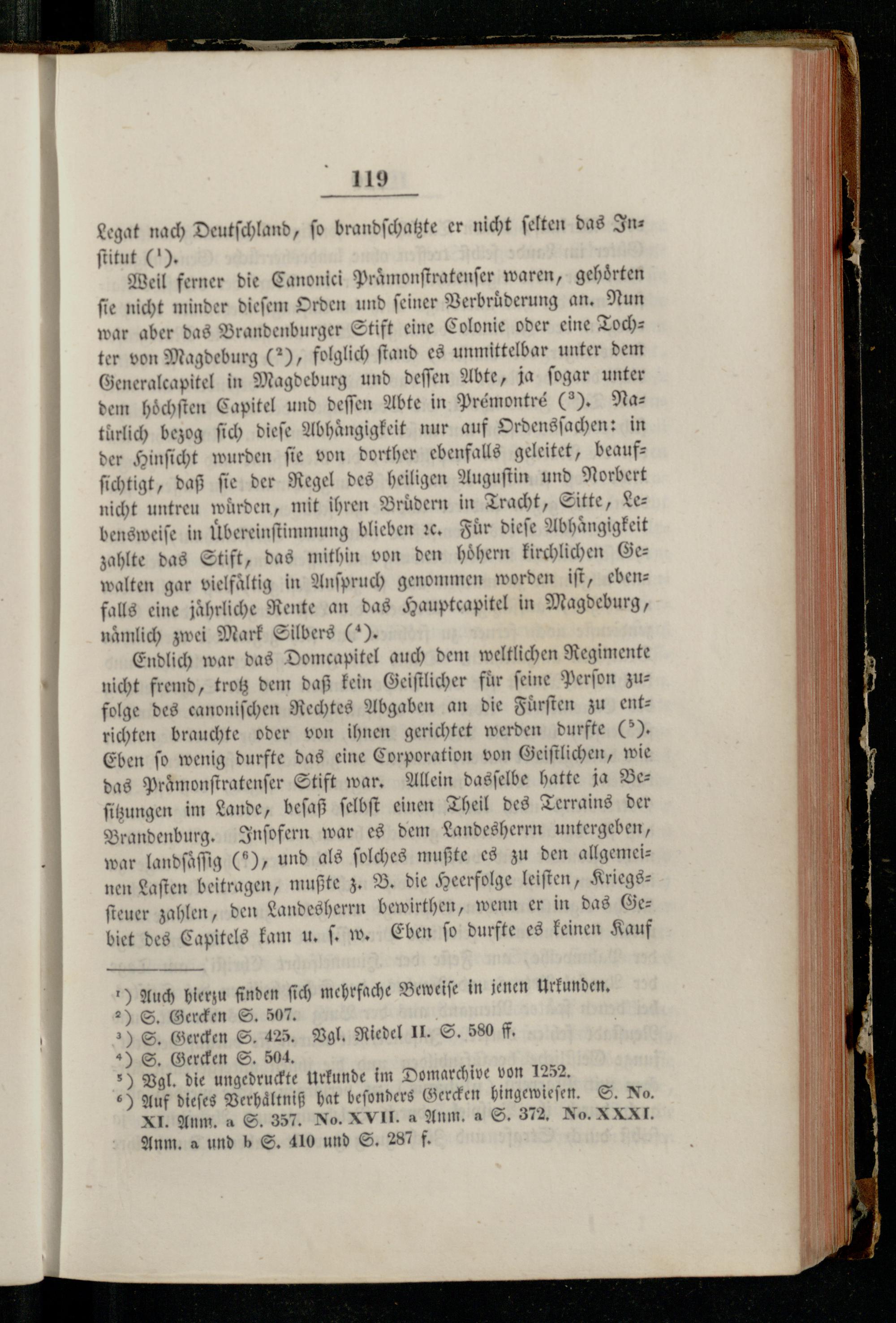 Weil ferner die Canoniei Praͤmonſtratenſer waren, gehoͤrten ſie nicht minder dieſem Orden und ſeiner Verbruͤderung an. Nun war aber das Brandenburger Stift eine Colonie oder eine Tochter von Magdeburg(*), folglich ſtand es unmittelbar unter dem Generalcapitel in Magdeburg und deſſen Abte, ja ſogar unter dem hoͤchſten Capitel und deſſen Abte in Prémontré(2). Natürlich bezog ſich dieſe Abhaͤngigkeit nur auf Ordensſachen: in der Hinſicht wurden fie von dorther ebenfalls geleitet, beaufſichtigt, daß ſie der Regel des heiligen Auguſtin und Norbert nicht untreu würden, mit ihren Brüdern in Tracht, Sitte, Lebensweiſe in uͤbereinſtimmung blieben 2. Für dieſe Abhaͤngigkeit zahlte das Stift, das mithin von den hoͤhern kirchlichen Ge— walten gar vielfältig in Anſpruch genommen worden iſt, ebenfalls eine jährliche Rente an das Hauptcapitel in Magdeburg, nämlich zwei Mark Silbers().