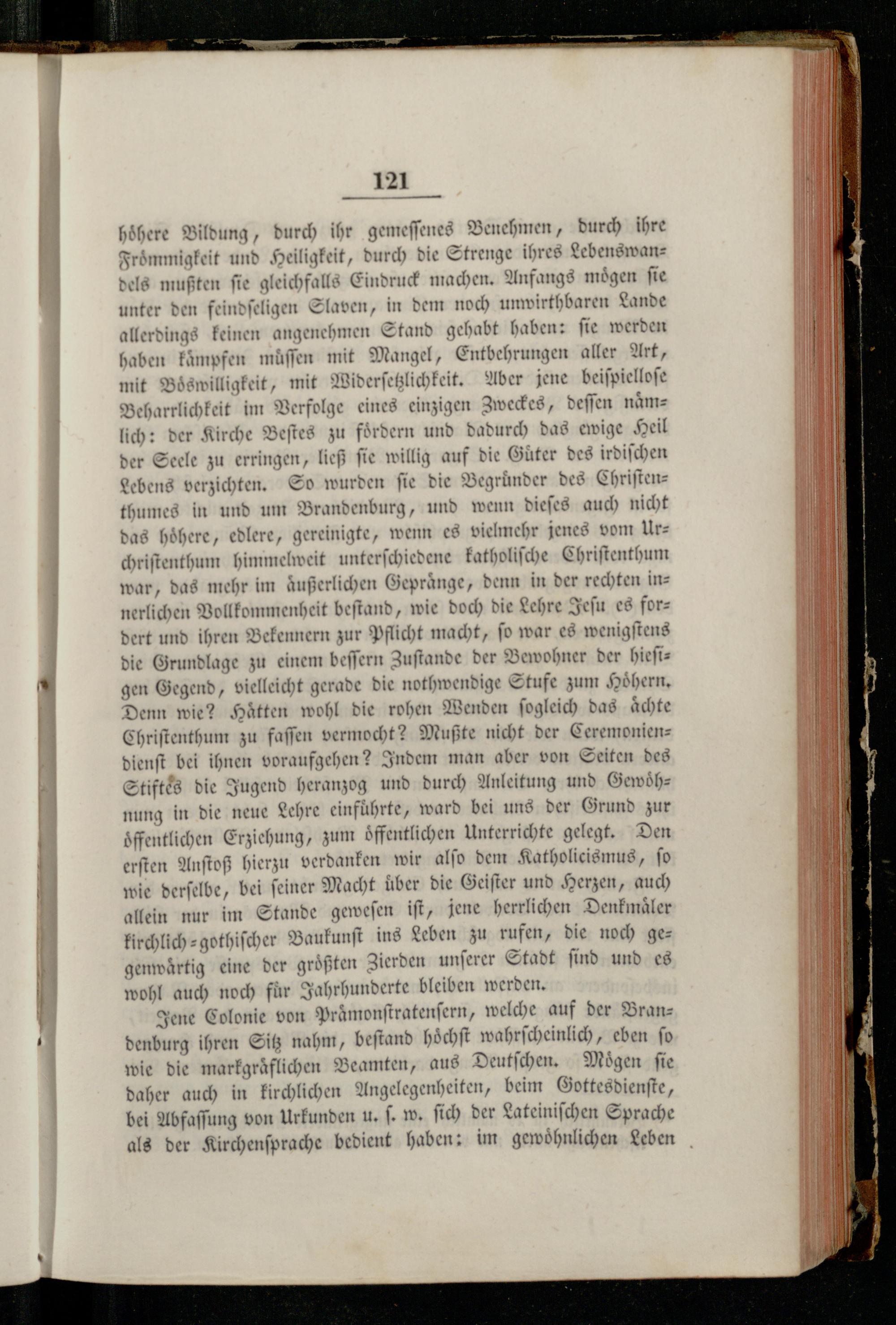höhere Bildung, durch ihr gemeſſenes Benehmen, durch ihre Frömmigkeit und Heiligkeit, durch die Strenge ihres Lebenswandels mußten ſie gleichfalls Eindruck machen. Anfangs moͤgen ſie unter den feindſeligen Slaven, in dem noch unwirthbaren Lande allerdings keinen angenehmen Stand gehabt haben: ſie werden haben kämpfen müſſen mit Mangel, Entbehrungen aller Art, mit Boͤswilligkeit, mit Widerſetzlichkeit. Aber jene beiſpielloſe Beharrlichkeit im Verfolge eines einzigen Zweckes, deſſen naͤmlich: der Kirche Beſtes zu fördern und dadurch das ewige Heil der Seele zu erringen, ließ ſie willig auf die Güter des irdiſchen Lebens verzichten. So wurden ſie die Begründer des Chriſtenthumes in und um Brandenburg, und wenn dieſes auch nicht das hoͤhere, edlere, gereinigte, wenn es vielmehr jenes vom Urs chriſtenthum himmelweit unterſchiedene katholiſche Chriſtenthum war, das mehr im aͤußerlichen Gepraͤnge, denn in der rechten innerlichen Vollkommenheit beſtand, wie doch die Lehre Jeſu es forz dert und ihren Bekennern zur Pflicht macht, ſo war es wenigſtens die Grundlage zu einem beſſern Zuſtande der Bewohner der hieſigen Gegend, vielleicht gerade die nothwendige Stufe zum Hoͤhern. Denn wie? Haͤtten wohl die rohen Wenden ſogleich das aͤchte Chriſtenthum zu faſſen vermocht? Mußte nicht der Ceremoniendienſt bei ihnen voraufgehen? Indem man aber von Seiten des Stiftes die Jugend heranzog und durch Anleitung und Gewoͤh— nung in die neue Lehre einfuͤhrte, ward bei uns der Grund zur offentlichen Erziehung, zum öffentlichen Unterrichte gelegt. Den erſten Anſtoß hierzu verdanken wir alſo dem Katholicismus, ſo wie derſelbe, bei ſeiner Macht über die Geiſter und Herzen, auch allein nur im Stande geweſen iſt, jene herrlichen Denkmaͤler kirchlich⸗gothiſcher Baukunſt ins Leben zu rufen, die noch gegenwaͤrtig eine der groͤßten Zierden unſerer Stadt ſind und es wohl auch noch fuͤr Jahrhunderte bleiben werden.