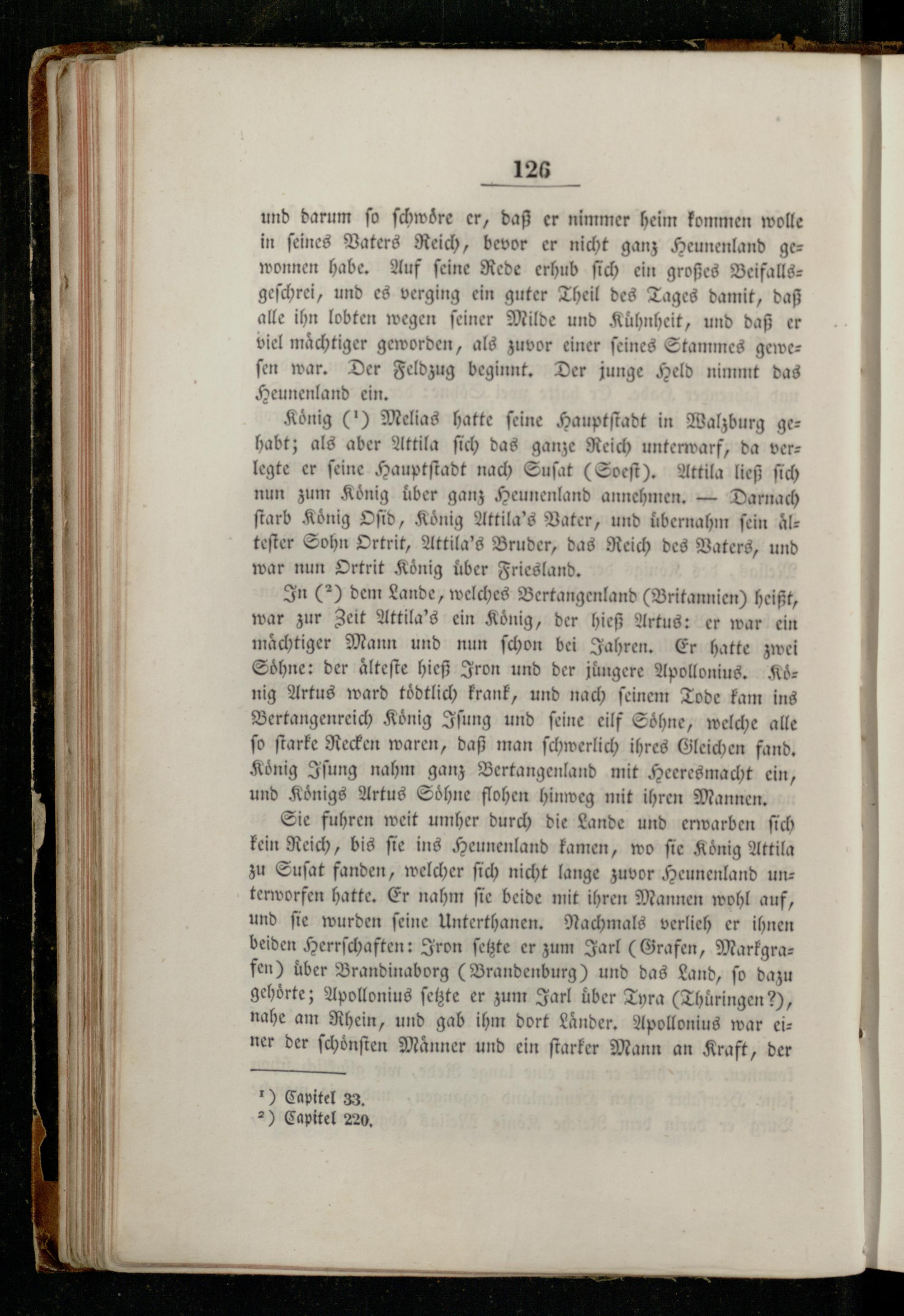 In(2) dem Lande, welches Bertangenland(Britannien) heißt, war zur Zeit Attila's ein König, der hieß Artus: er war ein maͤchtiger Mann und nun ſchon bei Jahren. Er hatte zwei Söhne: der aͤlteſte hieß Iron und der jüngere Apollonius. Koͤnig Artus ward toͤdtlich krank, und nach ſeinem Tode kam ins Bertangenreich König Iſung und feine eilf Söhne, welche alle ſo ſtarke Recken waren, daß man ſchwerlich ihres Gleichen fand. Koͤnig Iſung nahm ganz Bertangenland mit Heeresmacht ein, und Koͤnigs Artus Soͤhne flohen hinweg mit ihren Mannen.