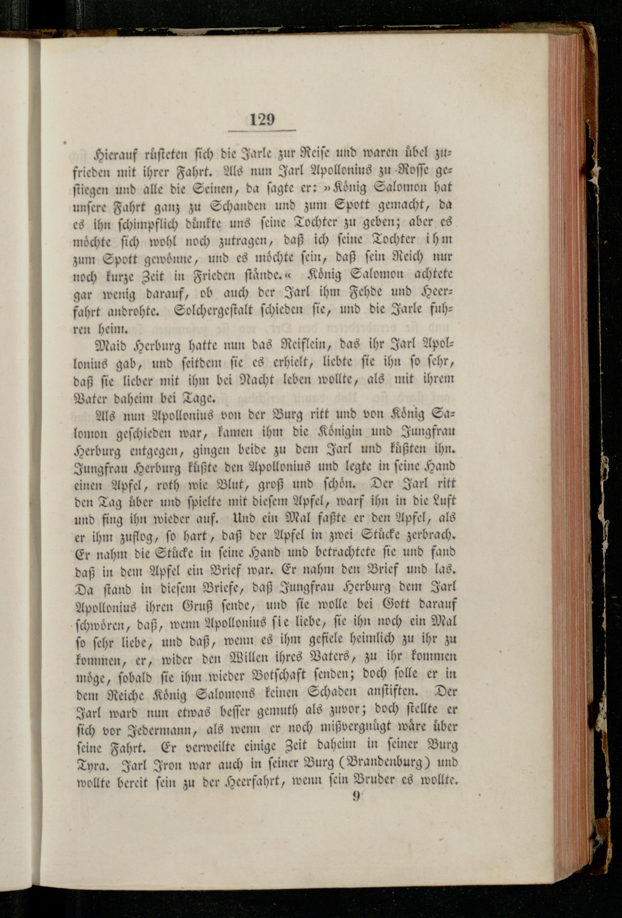 Als nun Apollonius von der Burg ritt und von König Sa— lomon geſchieden war, kamen ihm die Königin und Jungfrau Herburg entgegen, gingen beide zu dem Jarl und kuͤßten ihn. Jungfrau Herburg kuͤßte den Apollonius und legte in ſeine Hand einen Apfel, roth wie Blut, groß und ſchoͤn. Der Jarl ritt den Tag über und ſpielte mit dieſem Apfel, warf ihn in die Luft und fing ihn wieder auf. Und ein Mal faßte er den Apfel, als er ihm zuflog, fo hart, daß der Apfel in zwei Stücke zerbrach. Er nahm die Stuͤcke in ſeine Hand und betrachtete ſie und fand daß in dem Apfel ein Brief war. Er nahm den Brief und las. Da ſtand in dieſem Briefe, daß Jungfrau Herburg dem Jarl Apollonius ihren Gruß ſende, und ſie wolle bei Gott darauf ſchwoͤren, daß, wenn Apollonius ſie liebe, ſie ihn noch ein Mal ſo ſehr liebe, und daß, wenn es ihm gefiele heimlich zu ihr zu kommen, er, wider den Willen ihres Vaters, zu ihr kommen moͤge, ſobald ſie ihm wieder Botſchaft ſenden; doch ſolle er in dem Reiche Koͤnig Salomons keinen Schaden anſtiften. Der