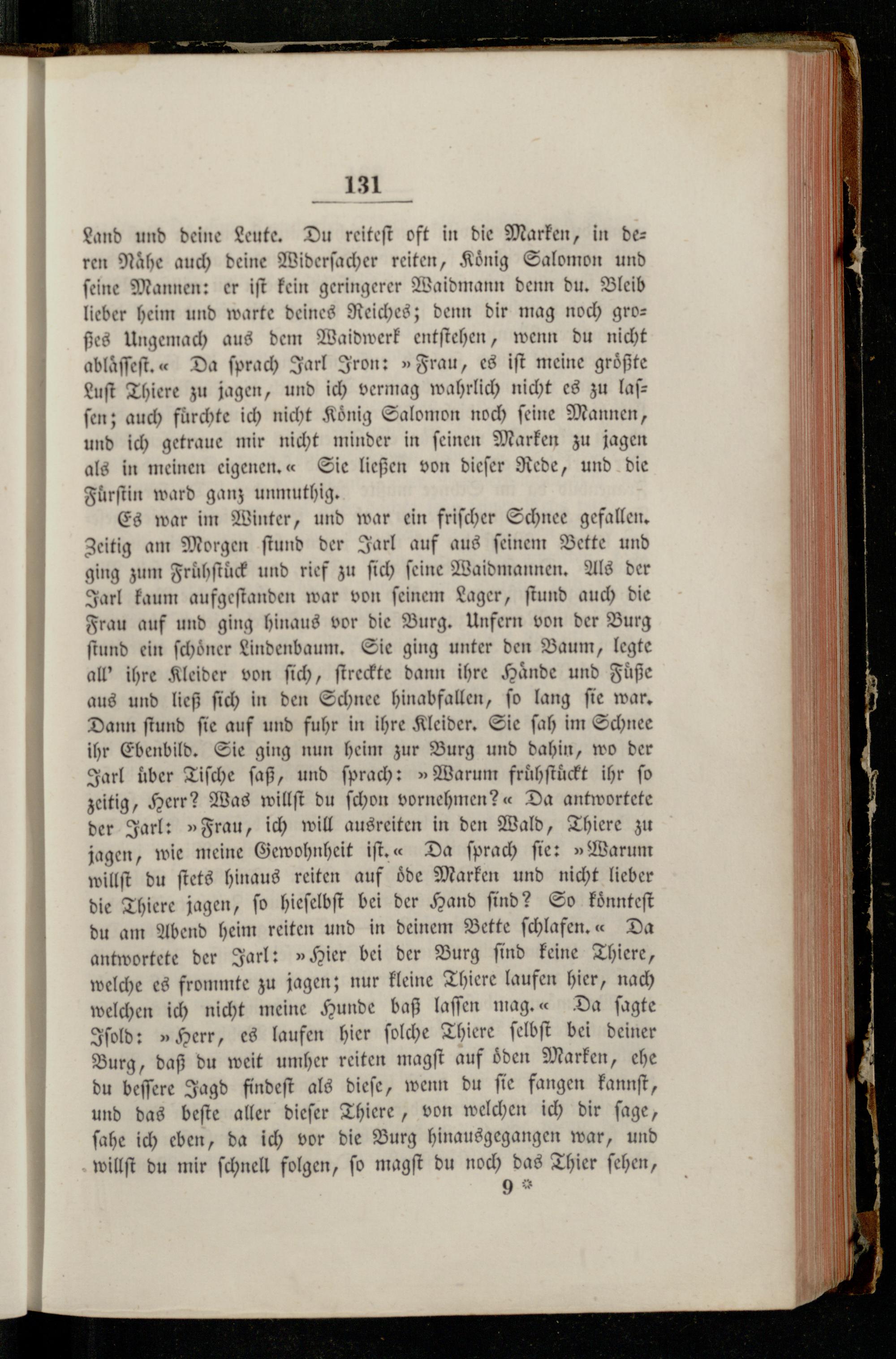 Es war im Winter, und war ein friſcher Schnee gefallen. Zeitig am Morgen ſtund der Jarl auf aus ſeinem Bette und ging zum Fruͤhſtuͤck und rief zu ſich feine Waidmannen. Als der Jarl kaum aufgeſtanden war von ſeinem Lager, ſtund auch die Frau auf und ging hinaus vor die Burg. Unfern von der Burg ſtund ein ſchoͤner Lindenbaum. Sie ging unter den Baum, legte all' ihre Kleider von ſich, ſtreckte dann ihre Haͤnde und Fuͤße aus und ließ ſich in den Schnee hinabfallen, ſo lang ſie war. Dann ſtund ſie auf und fuhr in ihre Kleider. Sie ſah im Schnee ihr Ebenbild. Sie ging nun heim zur Burg und dahin, wo der Jarl über Tiſche ſaß, und ſprach:»Warum fruͤhſtuͤckt ihr fo zeitig, Herr? Was willſt du ſchon vornehmen?« Da antwortete der Jarl:»Frau, ich will ausreiten in den Wald, Thiere zu jagen, wie meine Gewohnheit iſt.«“ Da ſprach fie:»Warum willſt du ſtets hinaus reiten auf oͤde Marken und nicht lieber die Thiere jagen, fo hieſelbſt bei der Hand find? So koͤnnteſt du am Abend heim reiten und in deinem Bette ſchlafen.“ Da antwortete der Jarl:»Hier bei der Burg ſind keine Thiere, welche es frommte zu jagen; nur kleine Thiere laufen hier, nach welchen ich nicht meine Hunde baß laſſen mag.“ Da ſagte Iſold:» Herr, es laufen hier ſolche Thiere ſelbſt bei deiner Burg, daß du weit umher reiten magſt auf oͤden Marken, ehe du beſſere Jagd findeſt als dieſe, wenn du ſie fangen kannſt, und das beſte aller dieſer Thiere, von welchen ich dir ſage, ſahe ich eben, da ich vor die Burg hinausgegangen war, und willſt du mir ſchnell folgen, ſo magſt du noch das Thier ſehen,