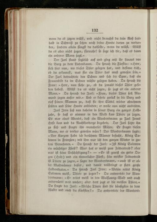 Jarl Iron ſaß nun daheim in ſeiner Burg ein ganzes Halbjahr, ſo daß er nimmer in den Wald kam Thiere zu jagen. Es war eines Abends, daß ein Wandersmann zu Jarl Irons Hofe kam und da Nachtherberge begehrte. Der Jarl ſetzte ihn zu ſich und fragte ihn mancherlei Maͤhre. Er fragte dieſen Mann, wo er vorher geweſen waͤre? Der Wandersmann ſagte: » Bor Kurzem habe ich berühmte Männer beſucht, König Salomon in Franzien; mit ihm war ich den ganzen Winter in gutem Vernehmen.“ Da ſprach der Jarl:»Iſt König Salomon ein mächtiger Fuͤrſt? Was hat er meiſt zum Zeitvertreib? oder was iſt feine Beſchaͤftigung?«—»Er iſt gewiß ein guter Des gen(Held) und ein theuerlicher Fuͤrſt; ſein meiſter Zeitvertreib iſt Thiere zu jagen,« ſagte der Wandersmann,»auch iſt er al— ler Waidmaͤnner beſter, und damit vollbringt er ſtets große Heldenthaten.“ Da ſprach Jarl Iron:» Wohin reitet König Salomon meiſt, Thiere zu jagen?« Da antwortete der Wan— dersmann:»Er reitet meiſt in den Walſlaung-Wald und auch anderwaͤrts weit umher; aber dort jagt er die meiſten Thiere.« Da fragte der Jarl:»Welche Thiere ſind die haͤufigſten in dem Walde und auch die ſtaͤrkſten?« Da antwortete der Wanders—