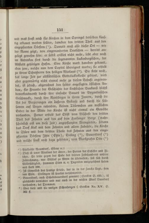 im Andenken fort— die ſogenannten Luckenbergiſchen, der Altſtadt gehörigen Hufen. Eine Kirc he ward daneben gebauet, eben jene, welche nun dem Capitel übereignet wurde; ſie erhielt zu ihrem Schutzherrn den heiligen Nicolaus(2). Sie ſteht noch, hat lange Zeit zur altſtaͤdtiſchen Gottesackerkirche gedient, wird aber gegenwaͤrtig nicht einmal mehr zu d dieſem Behufe angewendet, iſt jedoch, abgerechnet den ſpaͤter angefuͤgten oͤſtlichen Unz bau, für Freunde der Geſchichte der kirchlichen Baukunſt hoͤchſt bemerkenswerth durch ihre einfache Bauart im Byzantiniſchen Geſchmacke, durch ihre Rundbogen in ihrem Innern, durch die Art der Verzierungen am aäͤußeren Geſimſe und durch die ſeltſamen auf Bogen ruhenden, kleinen Thuͤrmchen am weſtlichen Ende: in der Mitte der Kirche iſt nicht einmal ein Gewoͤlbe vorhanden. Ferner erhielt das Stift vom Biſchofe den dritten Theil des Zehnten aus den auf dem Harlunger Berge(wahr—