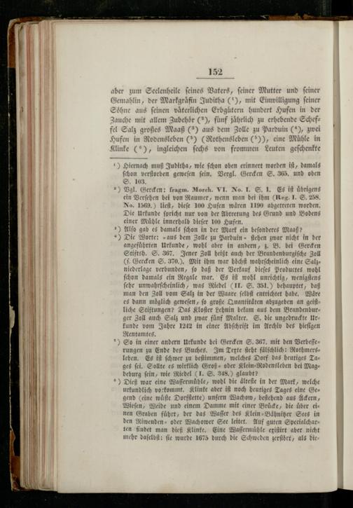 152 aber zum Seelenheile ſeines Vaters, feiner Mutter und feiner Gemahlin, der Markgraͤfin Juditha(1), mit Einwilligung feiner ohne aus feinen vaͤterlichen Erbgütern hundert Hufen in der auche mit allem Zubehör(2), fünf. 2 erhebende Schefel Salz großes Maaß(2) aus dem Zolle zu Parduin(“), zwei . in Rodensleben(5)(Rothensle ben 6 5, eine Mühle in inke(“), ingleichen ſechs von frommen Leuten geſchenkte