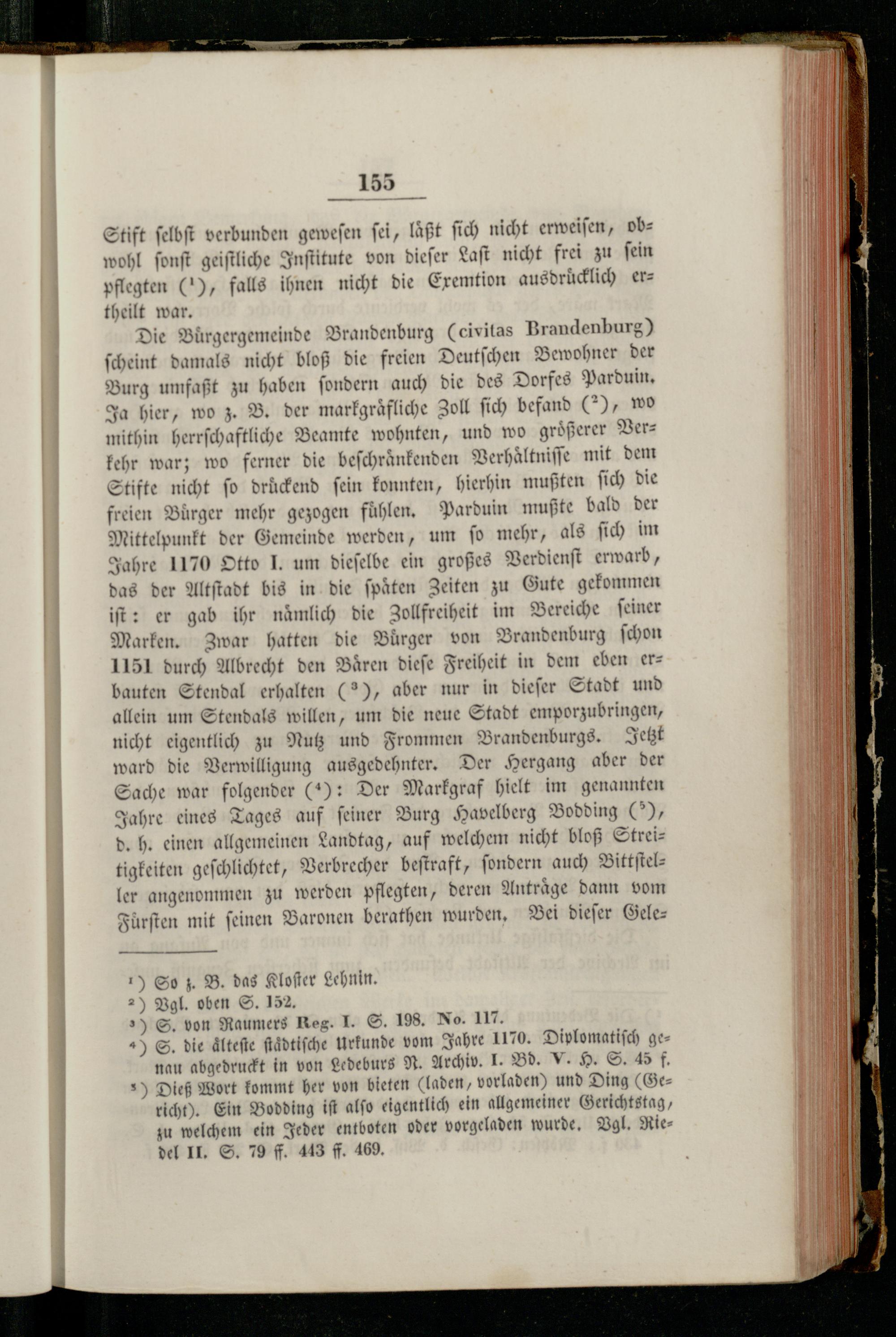 Die Burgergemeinde Brandenburg(Ceivitas Brandenburg) ſcheint damals nicht bloß die freien Deutſchen Bewohner der Burg umfaßt zu haben ſondern auch die des Dorfes Parduin. Ja hier, wo z. B. der markgraͤfliche Zoll ſich befand(*), wo mithin herrſchaftliche Beamte wohnten, und wo größerer Verkehr war; wo ferner die beſchraͤnkenden Verhaͤltniſſe mit dem Stifte nicht fo druckend fein konnten, hierhin mußten ſich die freien Burger mehr gezogen fühlen, Parduin mußte bald der Mittelpunkt der Gemeinde werden, um ſo mehr, als ſich im Jahre 1170 Otto J. um dieſelbe ein großes Verdienſt erwarb, das der Altſtadt bis in die ſpaͤten Zeiten zu Gute gekommen iſt: er gab ihr nämlich die Zollfreiheit im Bereiche ſeiner Marken. Zwar hatten die Burger von Brandenburg ſchon 1151 durch Albrecht den Bären dieſe Freiheit in dem eben erbauten Stendal erhalten(2), aber nur in dieſer Stadt und allein um Stendals willen, um die neue Stadt emporzubringen, nicht eigentlich zu Nutz und Frommen Brandenburgs. Jetzt ward die Verwilligung ausgedehnter. Der Hergang aber der Sache war folgender(2): Der Markgraf hielt im genannten Jahre eines Tages auf ſeiner Burg Havelberg Bodding(5), d. h. einen allgemeinen Landtag, auf welchem nicht bloß Streitigkeiten geſchlichtet, Verbrecher beſtraft, ſondern auch Bittſteller angenommen zu werden pflegten, deren Anträge dann vom Fürften mit feinen Baronen berathen wurden. Bei dieſer Gele