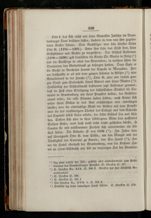 Otto J. hat ſich nicht wie feine Gemahlin Juditha im Brandenburger Dom beiſetzen laſſen, ſondern in dem von ihm gegrundeten Kloſter Lehnin. Sein Nachfolger war ſein aͤlteſter Sohn Otto Il.(1181- 1205). Unter ihm fuhr das Stift fort, ſeine Beſitzthumer und Rechte zu vergrößern. Der Biſchof Baldemar (1180— 1190) gab demſelben die Kirche St. Nicolai in Borg(9) und die Seelſorge in allen den Gemeinden, in welchen ſchon die Domherren den Gottesdienſt zu beſorgen hatten. Dazu fügte er die Kirche in Vercheſar ſammt der Capelle in Marzahne. Ferner beſchenkte er es mit dem ganzen Zehnten in Ploͤtzin(*) oder Reinoldsdorf in der Zauche(*), Otto II. aber mit dieſem ganzen Dorfe zum Seelenheile ſeines Vaters und feiner Mutter(5). dinſichtlich der Biſchofswahl beſtimmte jetzt Baldemar genauer, aß im Fall einer Erledigung des biſchoͤflichen Stuhles die Canonici in Brandenburg um ihres Propſtes willen, der Archidiaconus waͤre, die erſte Stimme haben ſollten, auch Keiner ſich wider ihren Willen in das Amt einſchleichen oder eindraͤngen duͤrfte; wen die eintraͤchtige Wahl der Brüder mit dem Propſte oder die des verſtaͤndigern Theiles des Collegii aus dem Schooße des Capitels ſelbſt kieſen wuͤrde, der ſollte Biſchof ſein und bleiben. Sofern ſich aber in ihrer ſelbſteignen Mitte kein paſſendes Subject faͤnde, was doch wohl nicht leicht geſchehen durfte, ſo koͤnnten fie mit vollkommner Freiheit ſich anderswoher ein ſol