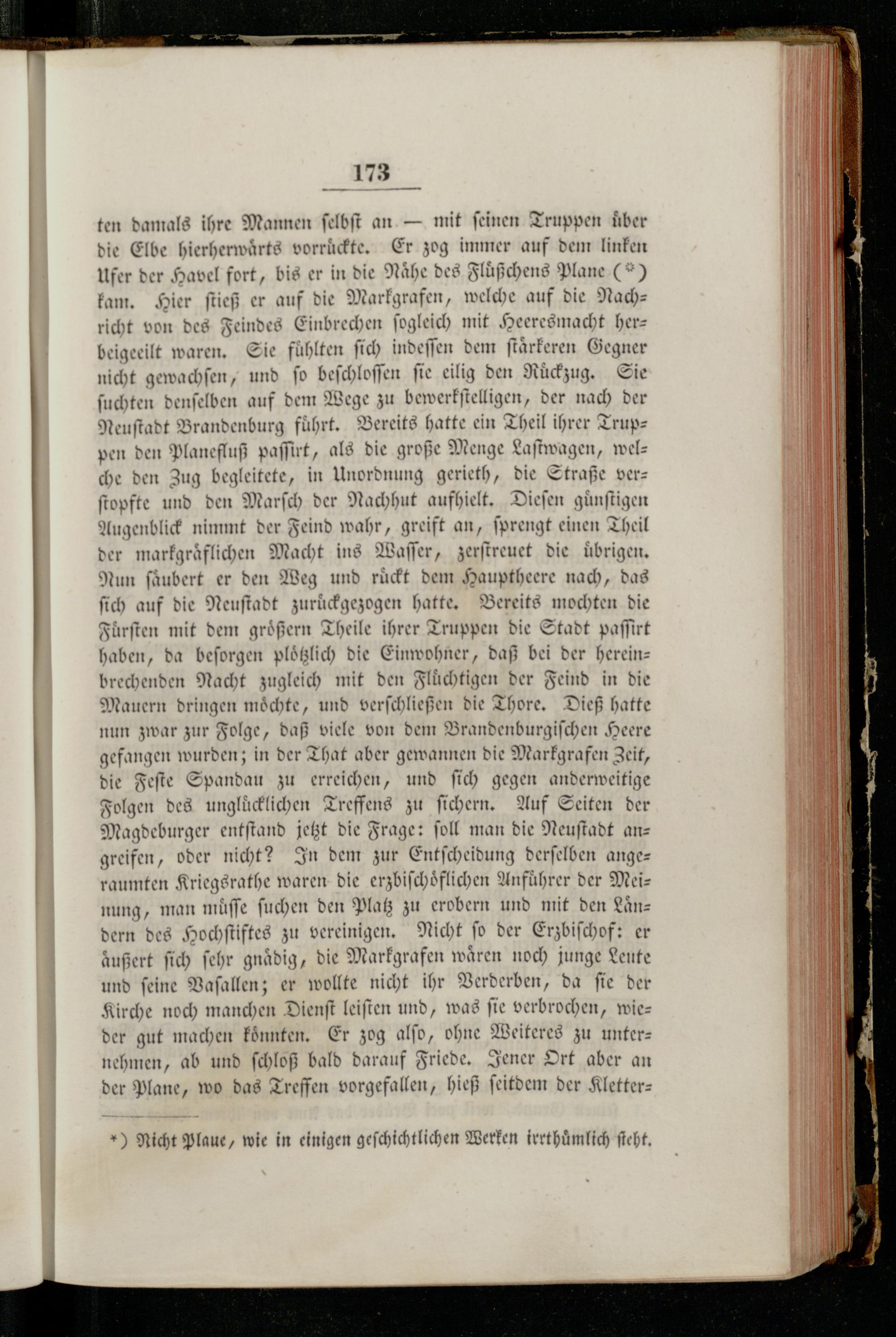 17: ten damals ihre Mannen ſelbſt an— mit feinen Truppen über die Elbe hierherwaͤrts vorruͤckte. Er 508 immer auf dem linken Ufer der Havel fort, bis er in die Nähe des Fluͤßchens Plane(*) kam. Hier ſtieß er auf die Markgrafen, welche auf die Nachricht von des Feindes Einbrechen ſogleich mit Heeresmacht herz beigeeilt waren. Sie fühlten ſich indeſſen dem ſtaͤrkeren Gegner nicht gewachſen, und ſo beſchloſſen fie eilig den Ruͤckzug. Sie ſuchten denſelben auf dem Wege zu bewerkſtelligen, der nach der Neuſtadt Brandenburg führt. Bereits hatte ein Theil ihrer Truppen den Planefluß paſſirt, als die große Menge Laſtwagen, welche den Zug begleitete, in Unordnung gerieth, die Straße ver— ſtopfte und den Marſch der Nachhut aufhielt. Dieſen guͤnſtigen Augenblick nimmt der Feind wahr, greift an, ſprengt einen Theil der markgraͤflichen Macht ins Waſſer, zerſtreuet die übrigen. Nun ſaͤubert er den Weg und rückt dem Hauptheere nach, das ſich auf die Neuſtadt zuruͤckgezogen hatte. Bereits mochten die Fuͤrſten mit dem groͤßern Theile ihrer Truppen die Stadt paſſirt haben, da beſorgen ploͤtzlich die Einwohner, daß bei der herein— brechenden Nacht zugleich mit den Flüchtigen der Feind in die Mauern dringen moͤchte, und verſchließen die Thore. Dieß hatte nun zwar zur Folge, daß viele von dem Brandenburgiſchen Heere gefangen wurden; in der That aber gewannen die Markgrafen Zeit, die Feſte Spandau zu erreichen, und ſich gegen anderweitige Folgen des ungluͤcklichen Treffens zu ſichern. Auf Seiten der Magdeburger entſtand jetzt die Frage: ſoll man die Neuſtadt angreifen, oder nicht? In dem zur Entſcheidung derſelben angeraumten Kriegsrathe waren die erzbiſchoͤflichen Anfuͤhrer der Meinung, man muͤſſe ſuchen den Platz zu erobern und mit den Laͤndern des Hochſtiftes zu vereinigen. Nicht ſo d der Erzbiſchof: er äußert ſich ſehr gnaͤdig, die Markgrafen wären noch jung Leute und ſeine Vaſallen; er wollte nicht ihr Verderben, da ſie der Kirche noch manchen Dienſt leiſten und, was ſie verbrochen, wieder gut machen koͤnnten. Er zog alſo, ohne Weiteres 1. unternehmen, ab und ſchloß bald darauf Friede. Jener Ort aber an