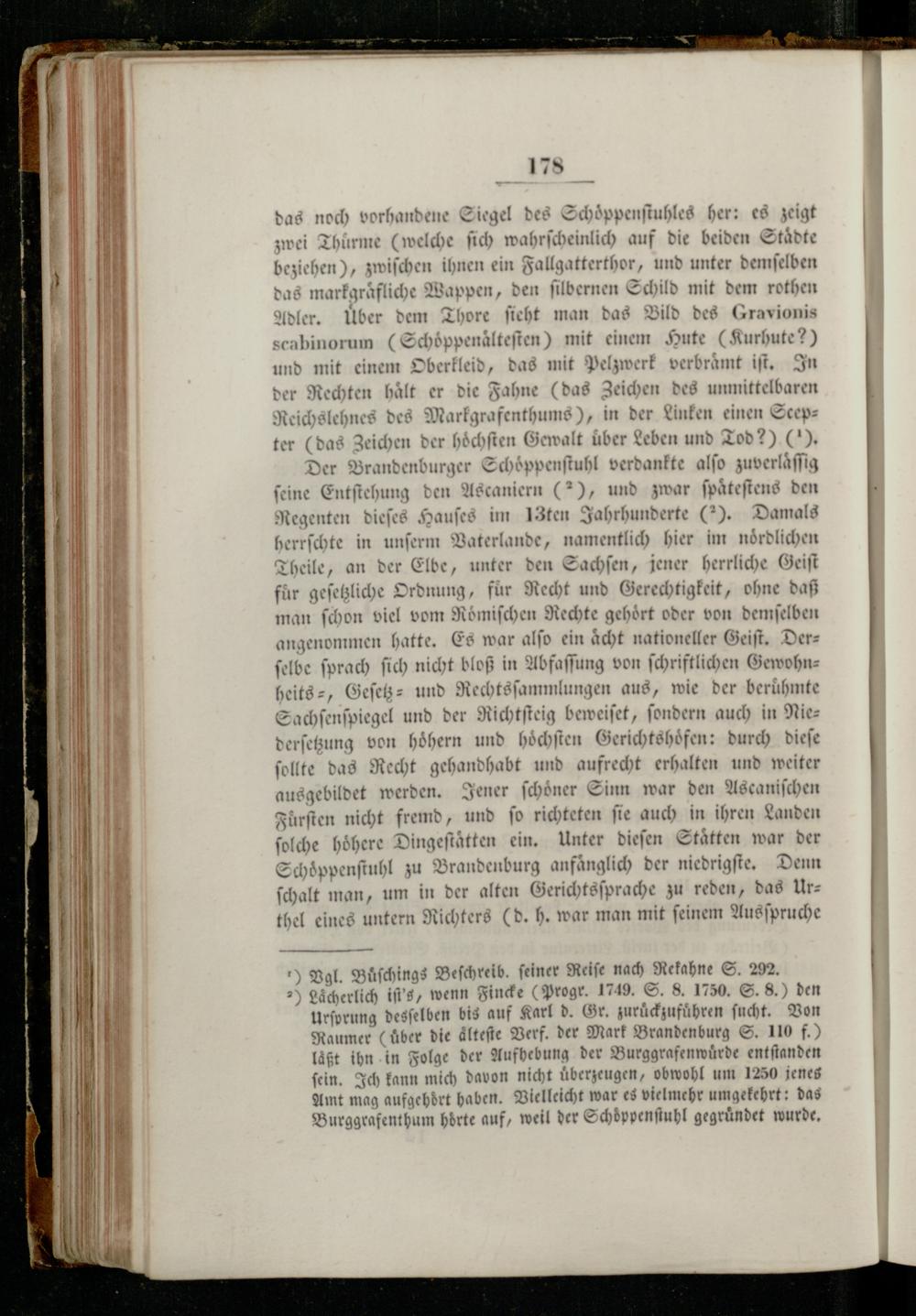 2) Lächerlich iſt's, wenn Finde(Progr. 1749. S. 8. 1750. S. 8.) den Urſprung desſelben bis auf Karl d. Gr. zurückzufüͤhren ſucht. Von Raumer(uͤber die aͤlteſte Verf. der Mark Brandenburg S. 110 f.) laͤßt ihn in Folge der Aufhebung der Burggrafenwuͤrde entſtanden ſein. Ich kann mich davon nicht überzeugen, obwohl um 1250 jenes Amt mag aufgehört haben. Vielleicht war es vielmehr umgekehrt: das Burggrafenthum hörte auf, weil der Schöppenſtuhl gegründet wurde.