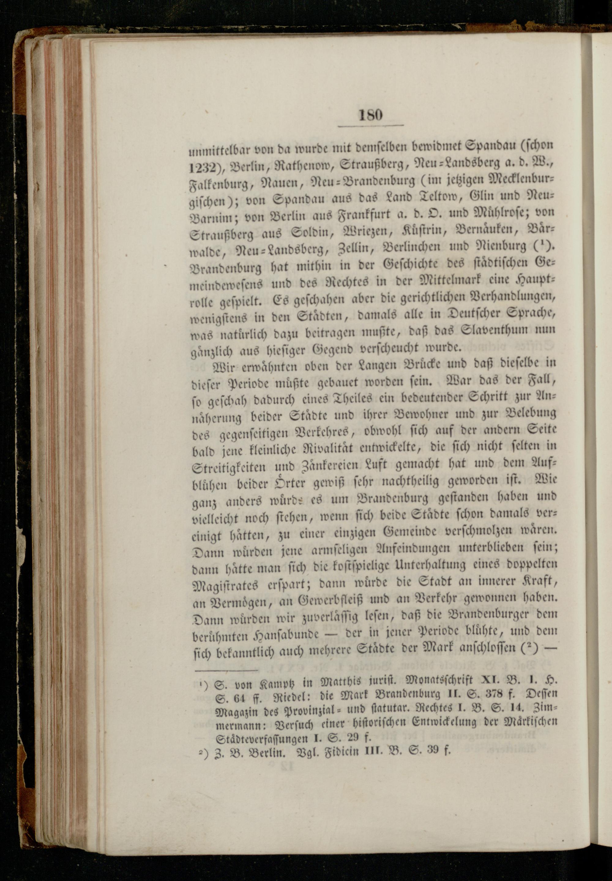 Wir erwähnten oben der Langen Brücke und daß dieſelbe in dieſer Periode mußte gebauet worden ſein. War das der Fall, ſo geſchah dadurch eines Theiles ein bedeutender Schritt zur Annaͤherung beider Städte und ihrer Bewohner und zur Belebung des gegenſeitigen Verkehres, obwohl ſich auf der andern Seite bald jene kleinliche Rivalität entwickelte, die ſich nicht ſelten in Streitigkeiten und Zaͤnkereien Luft gemacht hat und dem Aufblühen beider Srter gewiß ſehr nachtheilig geworden iſt. Wie ganz anders würde es um Brandenburg geſtanden haben und vielleicht noch ſtehen, wenn ſich beide Städte ſchon damals vereinigt hätten, zu einer einzigen Gemeinde verſchmolzen waͤren. Dann wurden jene armſeligen Anfeindungen unterblieben ſein; dann hätte man ſich die koſtſpielige Unterhaltung eines doppelten Magiſtrates erſpart; dann würde die Stadt an innerer Kraft, an Vermoͤgen, an Gewerbfleiß und an Verkehr gewonnen haben. Dann wurden wir zuverlaͤſſig leſen, daß die Brandenburger dem berühmten Hanſabunde— der in jener Periode bluͤhte, und dem ſich bekanntlich auch mehrere Staͤdte der Mark anſchloſſen(2)—