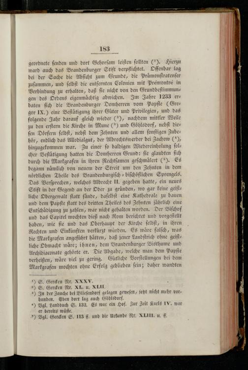 geordnete fenden und dort Gehorſam leiſten ſollten(1). Hierzu ward auch das Brandenburger Stift verpflichtet. Offenbar lag bei der Sache die Abſicht zum Grunde, die Praͤmonſtratenſer zuſammen, und ſelbſt die entfernten Colonien mit Prémontré in Verbindung zu erhalten, daß ſie nicht von den Grundbeſtimmungen des Ordens eigenmaͤchtig abwichen. Im Jahre 1233 erbaten ſich die Brandenburger Domherren vom Papſte(Gregor 1X.) eine Beſtaͤtigung ihrer Guͤter und Privilegien, und das folgende Jahr darauf gleich wieder(*, nachdem mittler Weile zu den erſtern die Kirche in Mune(3) und Goͤhlsdorf, nebſt dieſen Doͤrfern ſelbſt, nebſt dem Zehnten und allem ſonſtigen Zubehör, endlich das Allodialgut, der Albrechtswerder bei Zachow€), hinzugekommen war. Zu einer fo baldigen Wiedereinholung ſolcher Beſtaͤtigung hatten die Domherren Grund: ſie glaubten ſich durch die Markgrafen in ihren Rechtſamen geſchmaͤlert(). Es begann naͤmlich von neuem der Streit um den Zehnten in dem nördlichen Theile des Brandenburgiſch⸗biſchoͤflichen Sprengels. Das Verſprechen, welches Albrecht IL gegeben hatte, ein neues Stift in der Gegend an der Oder zu gründen, wo gar keine geiſtliche Obergewalt ſtatt fände, daſelbſt eine Kathedrale zu bauen und dem Papſte ſtatt des dritten Theiles des Zehnten jährlich eine Entſchaͤdigung zu zahlen, war nicht gehalten worden. Der Biſchof und das Capitel mochten dieß nach Rom berichtet und vorgeſtellt haben, wie ſie und das Oberhaupt der Kirche ſelbſt, in ihren Rechten und Einkünften verkuͤrzt wurden. Es wäre falſch, was die Markgrafen angeführt hätten, daß jener Landſtrich ohne geiſtliche Obmacht waͤre; ihnen, dem Brandenburger Bisthume und Archidiaconate gehörte er. Die Abgabe, welche man dem Papſte verheißen, wäre viel zu gering. Guͤtliche Vorſtellungen bei dem Markgrafen mochten ohne Erfolg geblieben ſein; daher wandten S. Gercken Nr. XXXV. ) S. Gercken Nr. XI. u. XIII 3) In der Zauche bei Blieſendorf gelegen geweſen, jetzt nicht mehr vor— handen. Eben dort lag auch Goöͤhlsdorf. ) Vgl. Landbuch S. 132. Es war ein Hof. Zur Zeit Karls IV. war er bereits wuͤſte. ) Vgl. Gercken S. 113 ff. und die Urkunde Nr. XLII. u. ff.