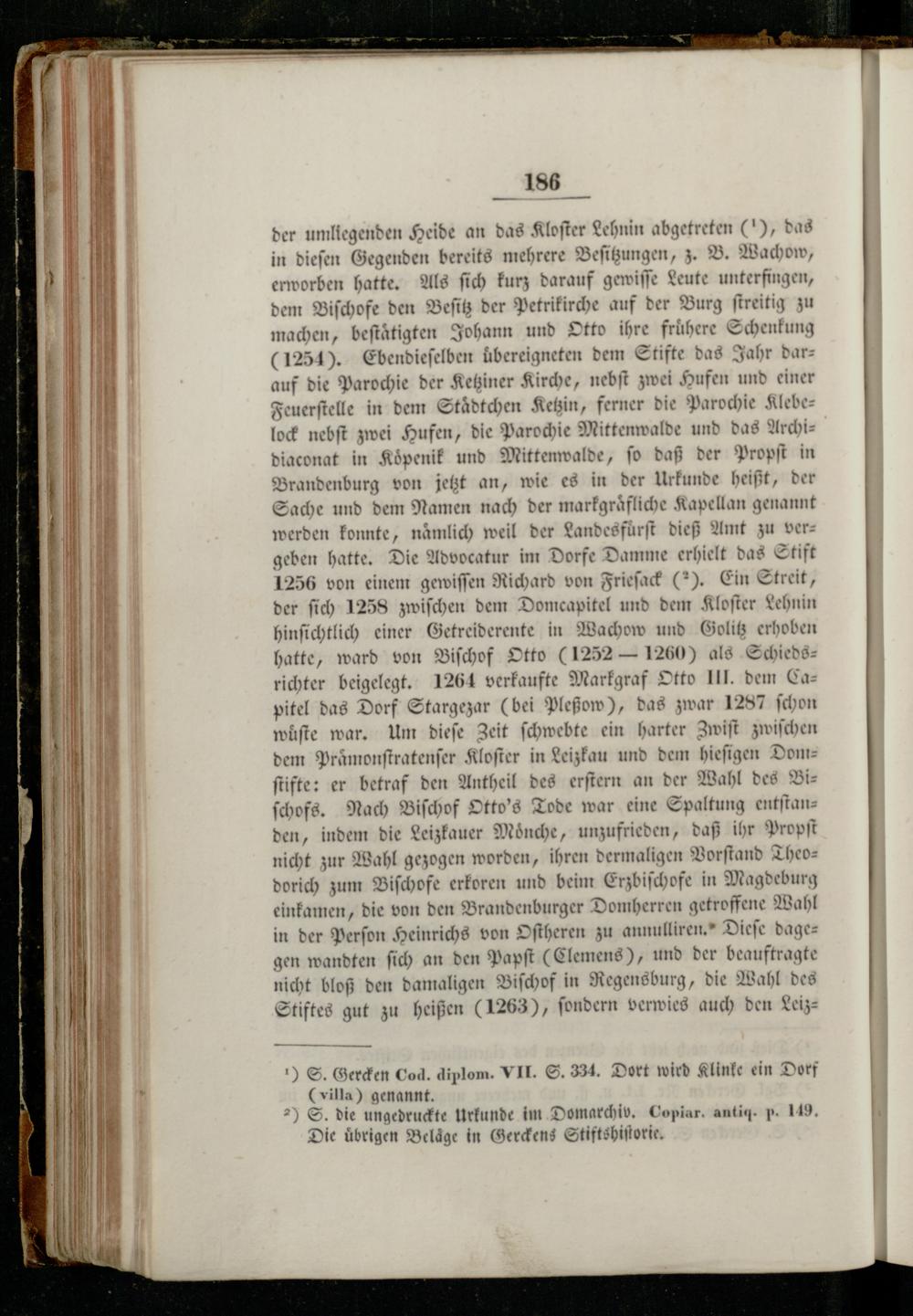 der umliegenden Heide an das Kloſter Lehnin abgetreten(1), das in dieſen Gegenden bereits mehrere Beſitzungen, z. B. Wachow, erworben hatte. Als ſich kurz darauf gewiſſe Leute unterfingen, dem Biſchofe den Beſitz der Petrikirche auf der Burg ſtreitig zu machen, beftätigten Johann und Otto ihre frühere Schenkung (1251). Ebendieſelben übereigneten dem Stifte das Jahr darauf die Parochie der Ketziner Kirche, nebſt zwei Hufen und einer Feuerſtelle in dem Städtchen Ketzin, ferner die Parochie Klebelock nebſt zwei Hufen, die Parochie Mittenwalde und das Archidiaconat in Koͤpenik und Mittenwalde, ſo daß der Propſt in Brandenburg von jetzt an, wie es in der Urkunde heißt, der Sache und dem Namen nach der markgraͤfliche Kapellan genannt werden konnte, nämlich weil der Landesfürſt dieß Amt zu vergeben hatte. Die Advocatur im Dorfe Damme erhielt das Stift 1256 von einem gewiſſen Richard von Frieſack(2). Ein Streit, der ſich 1258 zwiſchen dem Domcapitel und dem Kloſter Lehnin hinſichtlich einer Getreiderente in Wachow und Golitz erhoben hatte, ward von Biſchof Otto(1252— 1260) als Schiedsrichter beigelegt. 1261 verkaufte Markgraf Otto III. dem Capitel das Dorf Stargezar(bei Pleßow), das zwar 1287 ſchon wüßte war. Um dieſe Zeit ſchwebte ein harter Zwiſt zwiſchen dem Praͤmonſtratenſer Kloſter in Leizkau und dem hieſigen Domſtifte: er betraf den Antheil des erſtern an der Wahl des Biſchofs. Nach Biſchof Otto's Tode war eine Spaltung entſtanden, indem die Leizkauer Moͤnche, unzufrieden, daß ihr Propſt nicht zur Wahl gezogen worden, ihren dermaligen Vorſtand Theodorich zum Biſchofe erkoren und beim Erzbiſchofe in Magdeburg einkamen, die von den Brandenburger Domherren getroffene Wahl in der Perſon Heinrichs von Oſtheren zu annulliren.“ Dieſe dagegen wandten ſich an den Papſt(Clemens), und der beauftragte nicht bloß den damaligen Biſchof in Regensburg, die Wahl des Stiftes gut zu heißen(1263), ſondern verwies auch den Leiz—
